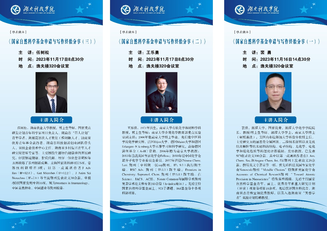 (本网讯 袁志辉)11月16日-17日,湘潭大学裴勇教授、南京大学王乐勇教授、湖南农业大学伍树松教授、湖南农业大学潘浪教授、湖南农业大学吴德志教授、湘潭大学汪璞和马忠云副教授等有成功申报和主持多项国家自然科学基金面上、青年项目的专家学者受邀来我校做国家自然科学基金申请经验分享与交流报告。