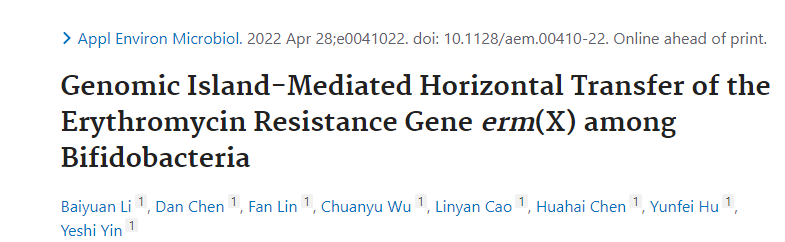 本网讯 (通讯员 李百元)近日,湖南科技学院化学与生物工程学院尹业师团队解析了红霉素耐药基因erm(X)在益生菌双歧杆菌间传播途径及其机制,相关研究成果发表于微生物领域经典学术期刊Applied and Environmental Microbiology《应用与环境微生物学》(中科院二区TOP,IF= 4.792),该期刊连同Nature、Science和PNAS一起被美国Special Libraries Association(《专门图书学会》)评选为“过去100年中最有影响力的100个杂志”之一。