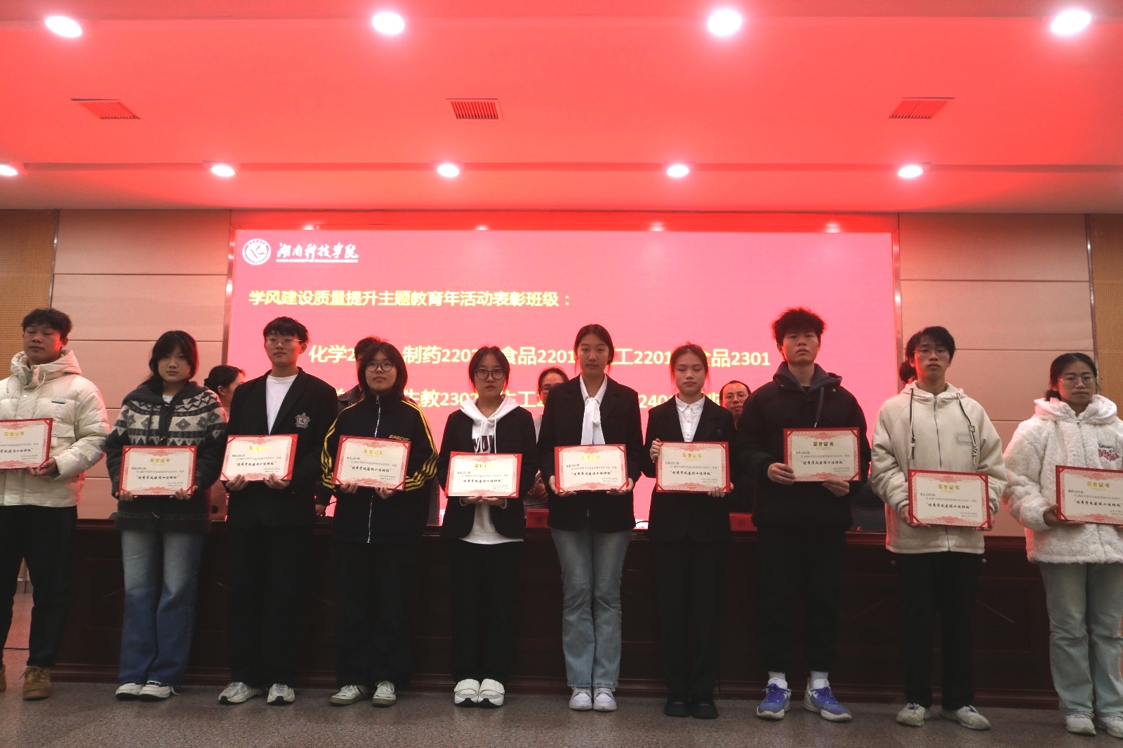 会上,陈宇宣读了学风建设质量提升主题教育年活动表彰的班级名单。获奖班级代表依次上台领取证书并合影留念。基艳老师强调学风建设之路如逆水行舟,不进则退,鼓励同学们向受表彰的班级看齐,戒骄戒躁,积极营造优良文明的学习氛围。现场氛围热烈,受表彰班级代表表示,珍惜荣誉,保持班级优良作风,团结班级同学们再创佳绩。