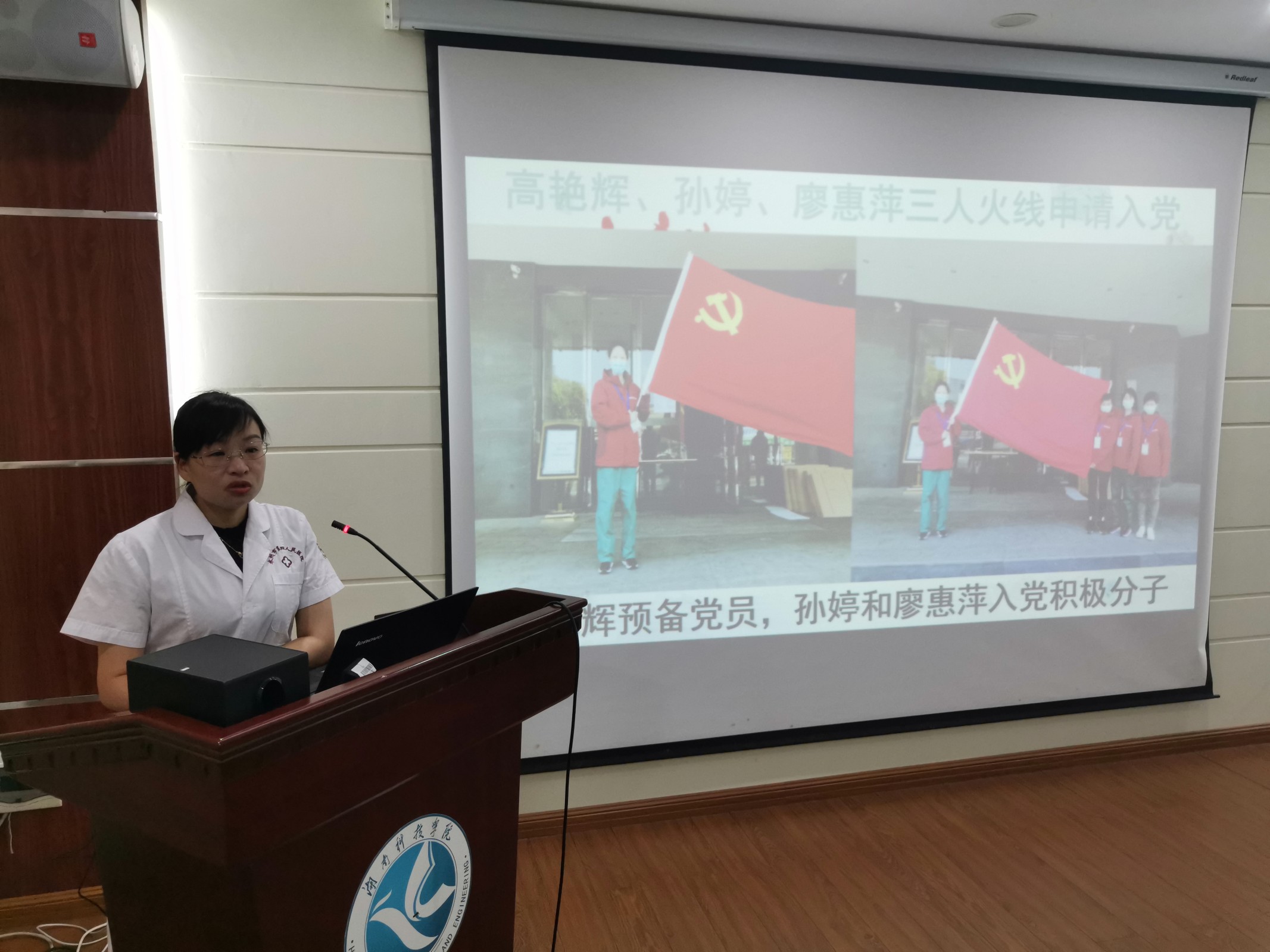 党课中,高艳辉、廖惠萍结合她们驰援湖北省黄冈市抗击新冠肺炎疫情的亲身经历,讲述了她们在抗疫工作和生活中的感人故事和瞬间,分享了她们在援鄂期间的体会和感悟,生动诠释了共产党员的初心使命和敢于担当的精神。在互动交流环节,“我不上谁上”“我是党员我先上”的铿锵话语,让在场的每一位党员同志深刻了解到最真实的一线战“疫”的艰辛和风险,被抗“疫”英雄们舍我其谁的医者情怀深深感动,不时响起阵阵掌声。