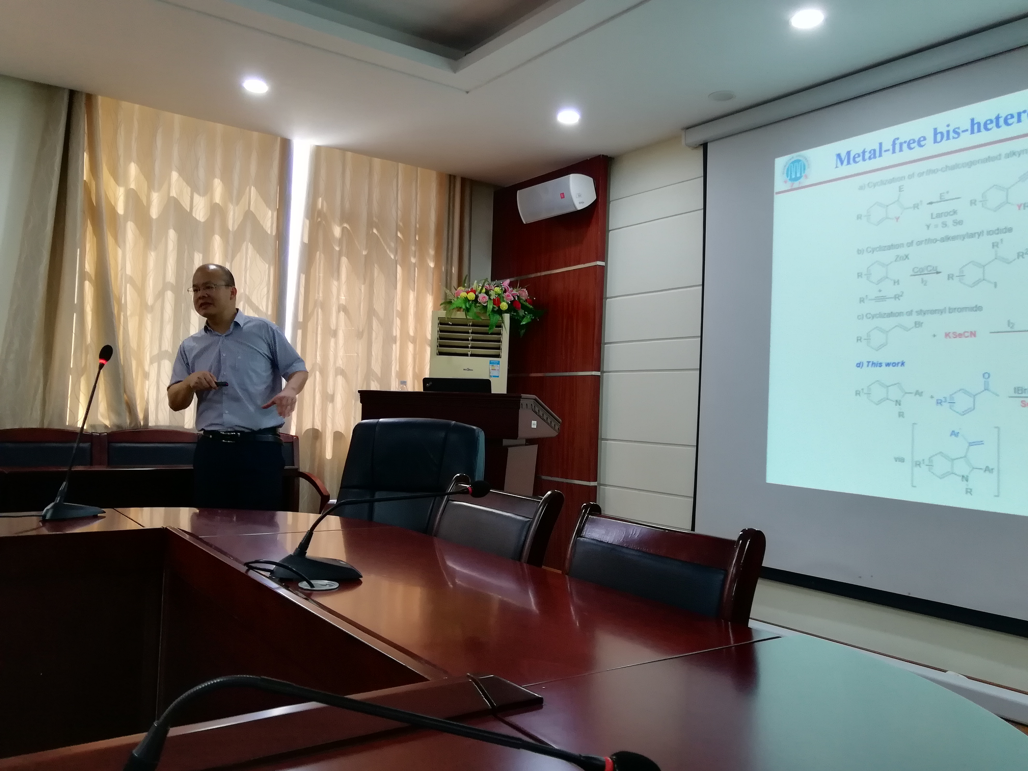 6月14日,湘潭大学对口支援安博站官网登录入口_安博(中国)工作推进会在我校召开。学校会议结束后,湘潭大学化学学院院长邓国军教授应邀在逸夫楼320室为我院老师和学生作题为《无过渡金属催化剂参与的吲哚直接功能化反应研究》的学术报告,报告会由刘小文院长主持。
