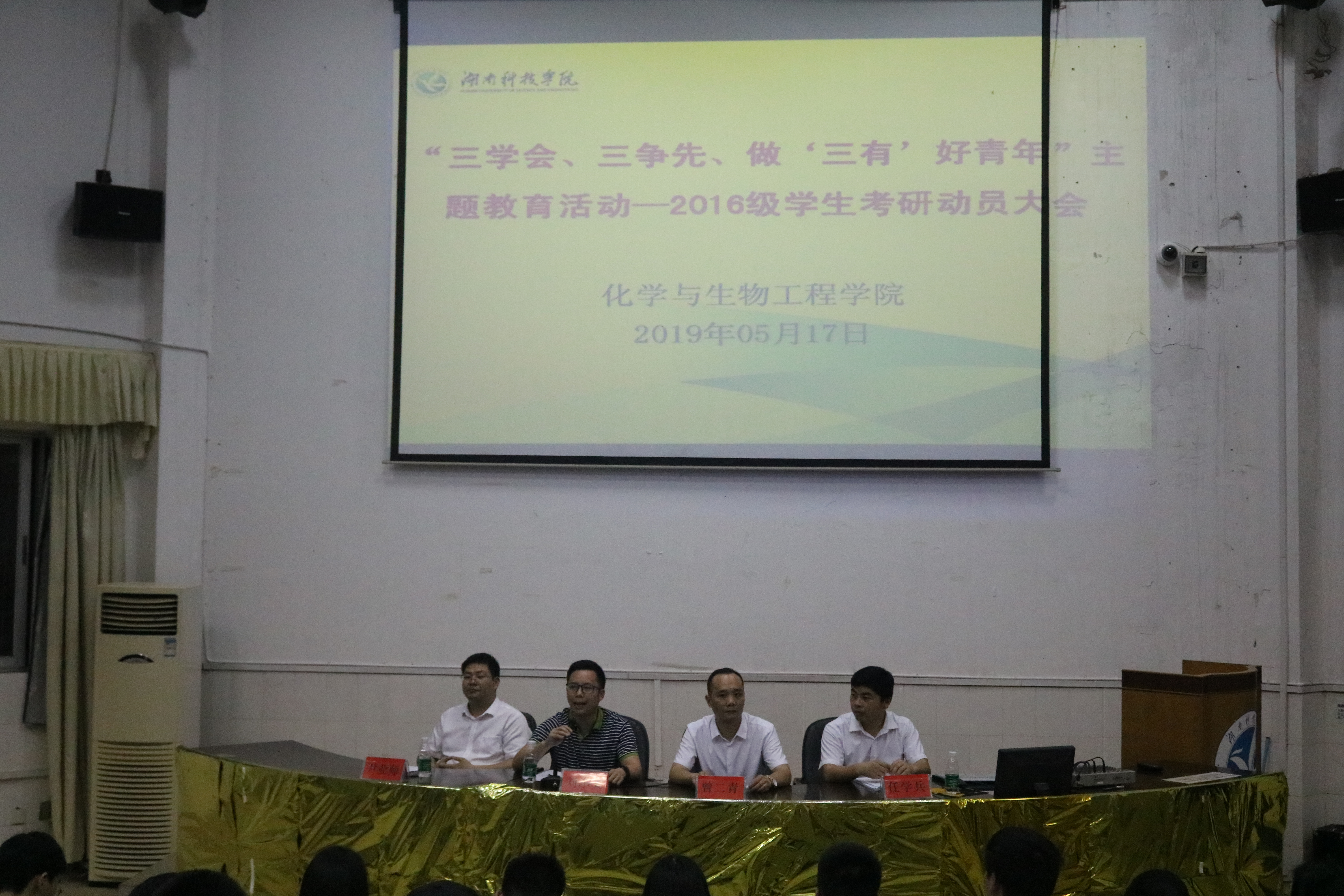 本网讯(通讯员 唐婉婷 唐菁)为进一步总结考研经验,净化学风,提升考研率,5月17日晚,学院在日新楼212举办考研动员大会暨考研经验交流会。院领导刘小文、曾二青、任学兵、尹业师及2015级考研优秀学生代表和2016级全体学生参加了会议。动员大会由党总支副书记任学兵主持。