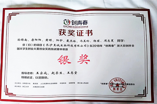 11月3日,由共青团中央、教育部、人力资源和社会保障部、中国科协、全国学联、浙江省政府主办,浙江大学、浙江团省委承办的2018年“创青春”浙大双创杯全国大学生创业大赛决赛落下帷幕。经过多轮比拼,我校由王宗成、赵荣生、王志堂老师指导,孙锡南、冯美玲等同学的作品《长沙至诚生物科技有限公司》喜获创业实践赛银奖,湖南省在此次大赛中斩获2金9银33铜,我校成为全省夺银的两所二本院校之一。