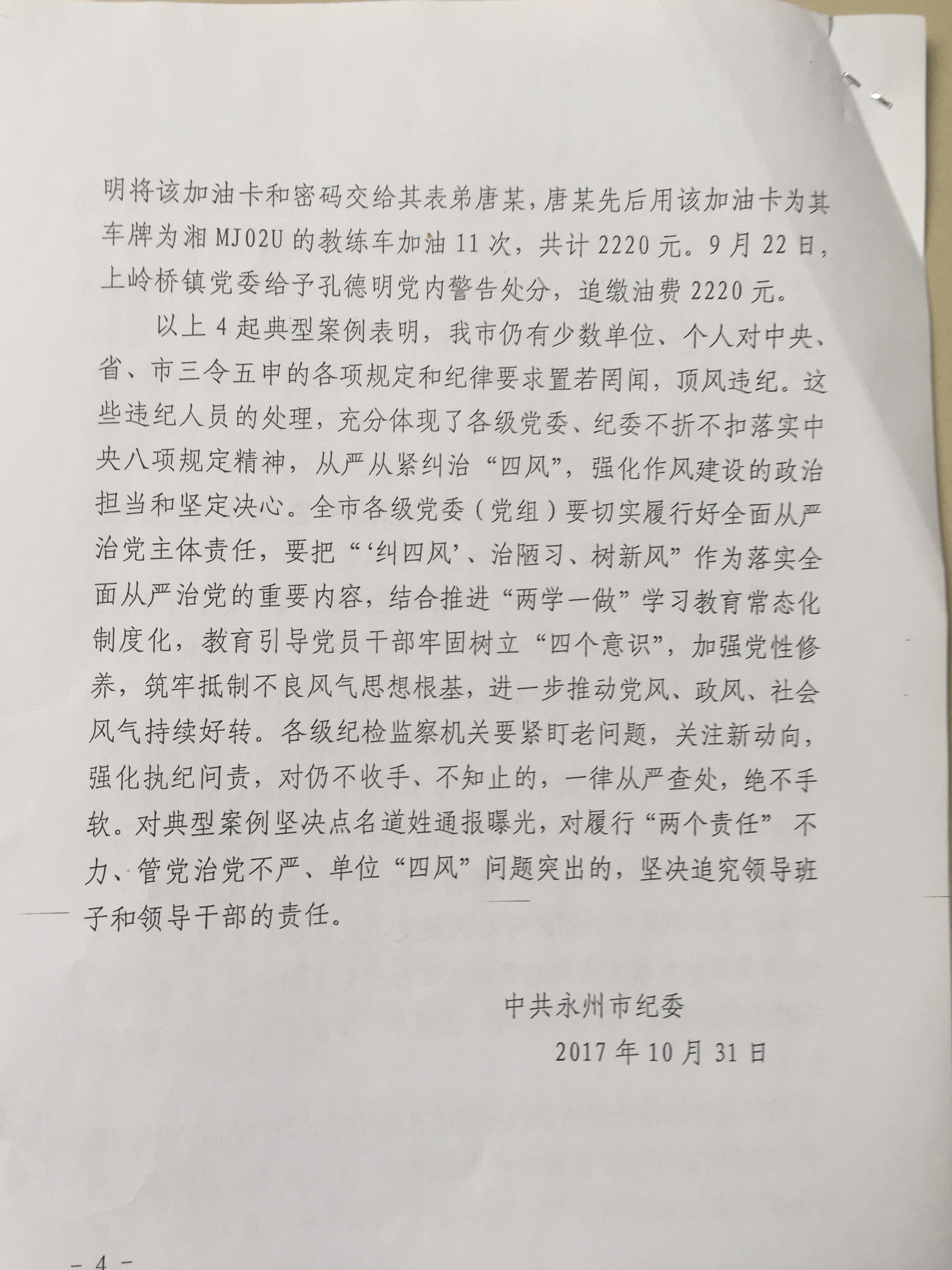 关于转发《中共永州市纪委关于4起违反作风建设规定典型案例通报》等文件的通知