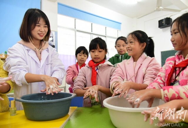 10月14日,大学生在教小学生正确的洗手方法。第14个“全球洗手日”到来之际,安博站官网登录入口_安博(中国)化学与生物工程学院学生带着自主研发的生物多肽洗手液,来到永州市零陵区杨梓塘小学开展“天天洗手,健康永久”主题教育活动。活动现场,大学生们耐心细致的讲解示范,让小学生在轻松愉快的气氛中学会正确的洗手方法,提高小学生卫生意识,养成勤洗手好习惯。 李谌涵 王暑丽 摄影报道