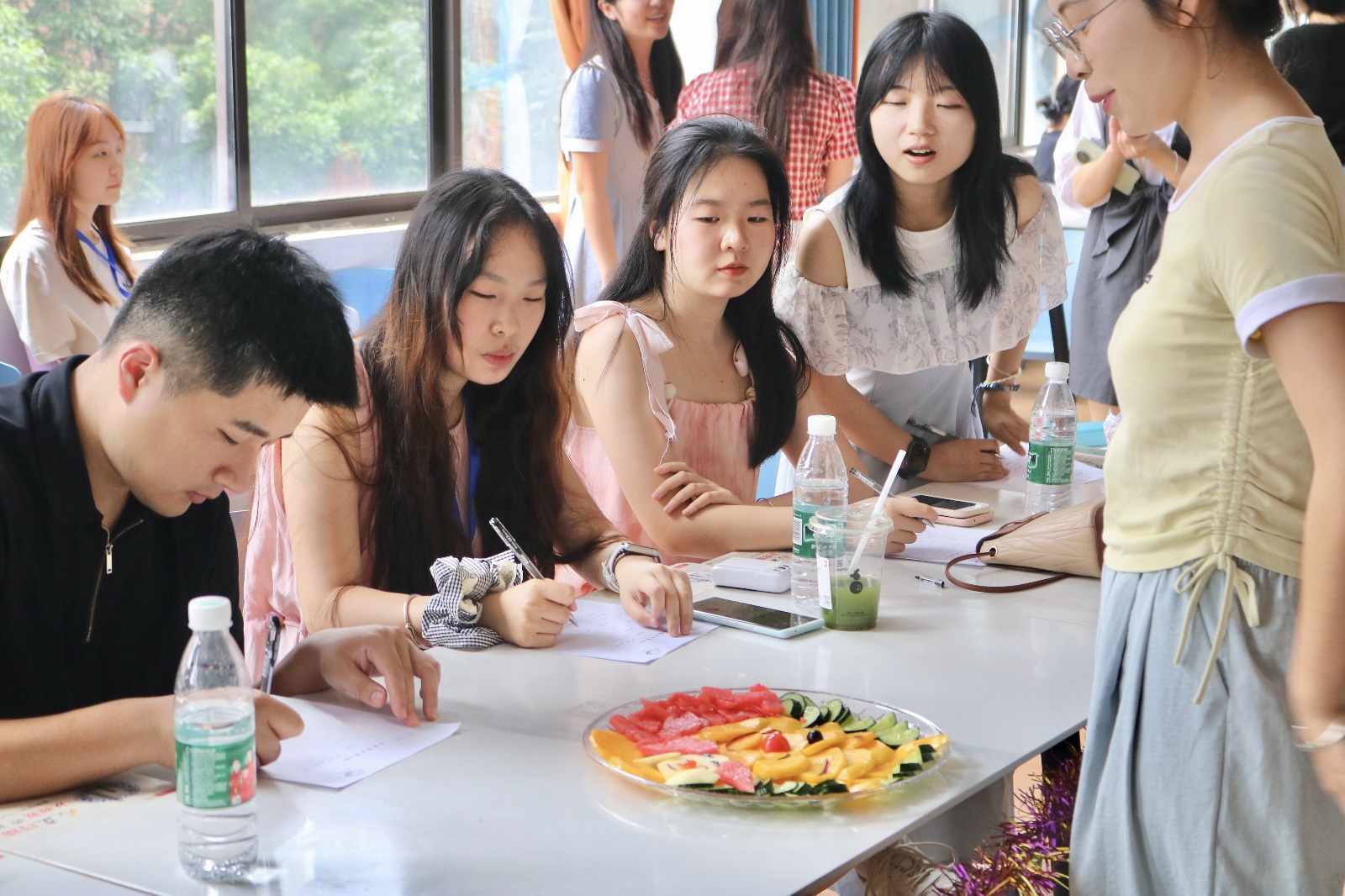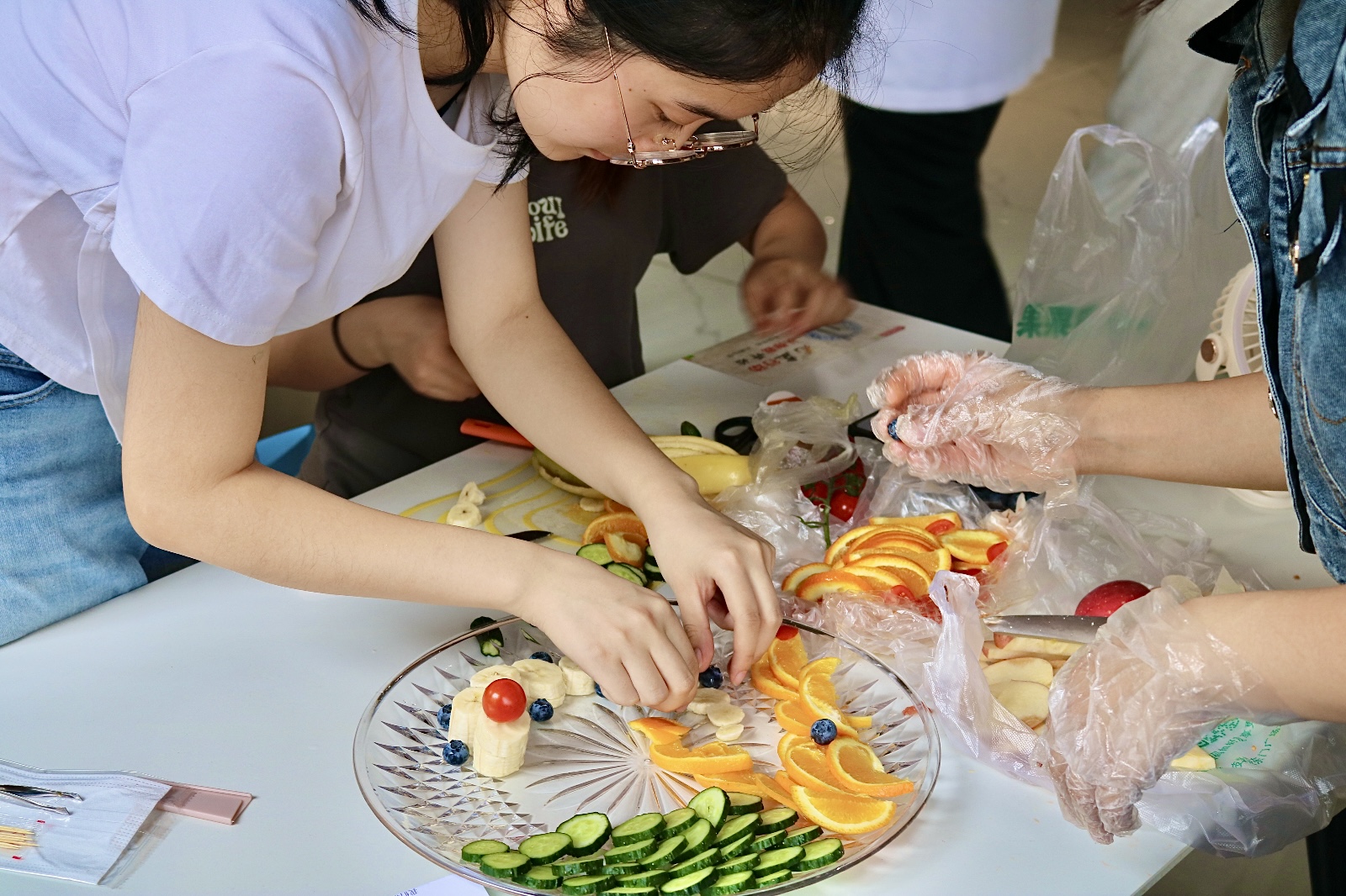活动伊始,工作人员开始对本次活动的规则详细讲解,并宣布比赛正式开始。随后,所有参赛小组带着提前准备好的比赛专用水果去到候场室等候,并按照分组顺序大小,在每组20分钟比赛时间计时结束后,依次进入比赛场地。制作过程中,同学们齐心协力,在团队的一片欢声笑语中,将水果们赋予生命,拼凑成一个个创意新颖的多彩水果拼盘。每两组制作完成后,两组的讲解代表各自发了时长一分半的讲解内容。经过一番讨论后,评委对两组作品进行打分。所有参赛小组制作完成后,一盘盘精美的水果拼盘陆续诞生。其中有红似骄阳的西瓜拼盘、有形如粽子的趣味拼盘、更有神似龙舟的精美拼盘等优秀作品。最后,工作人员统计分数,并按分数高低宣布了入选网络投票的十名小组。