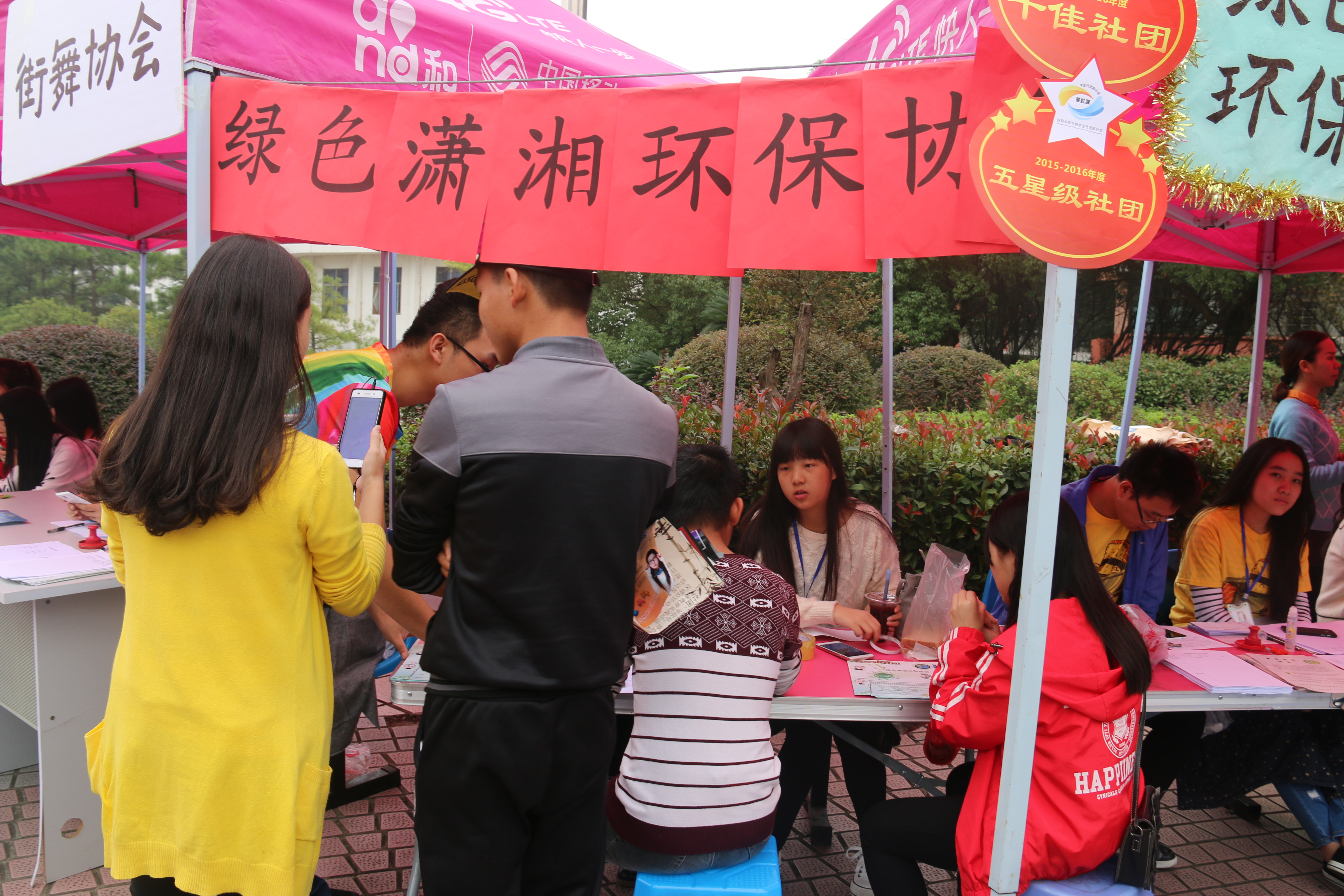 很多大一的新生在15号一大早就来到了文化广场,各社团争奇斗艳,场面气氛热闹非凡。化生院五大社团招新方式也可谓别出心裁,通过微信网络平台、布置宣传海报、发宣传单等方式不遗于力地招兵买马。食品营养协会制作了水果拼盘,绿色潇湘环保协会展出了环保作品,让新生们充分了解每个社团的创办理念、工作内容以及其特色。