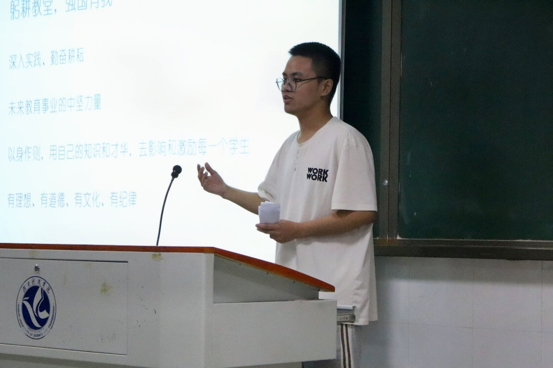 活动伊始,主持人宣布活动开始,为保证比赛的公平公正,主持人在赛前再次强调规则。随后由选手们依次上台演讲,选手们或是分享自己的经历,叙述着对三尺讲台的渴望,或是表达读名著、铸师德、做人民满意教师的决心。字字句句都表达着对教师这一神圣职业的憧憬。演讲现场精彩纷呈,高潮迭起,选手们一个个神采洋溢,慷慨激昂,充分展现了我院师范生积极进取、从教报国的良好精神风貌。