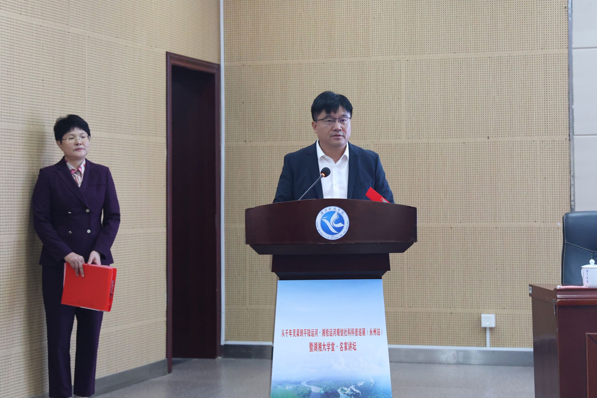 本网讯(记者 向薛峰 摄影 张倍嘉 温百石)11月7日,由中共湖南省委宣传部、湖南省社科联、广西社科联主办的2024年第4期“湖湘大学堂·名家讲坛”在我校举行。广西社科联副主席刘俊,湖南省社科联党组成员、副主席、秘书长(兼)贺建湘,永州市委常委、宣传部部长吴恢才,校党委书记李钢,校党委副书记、社科联主席宋宏福出席活动,活动由贺建湘主持。