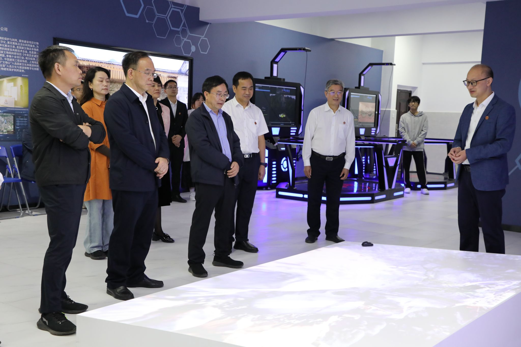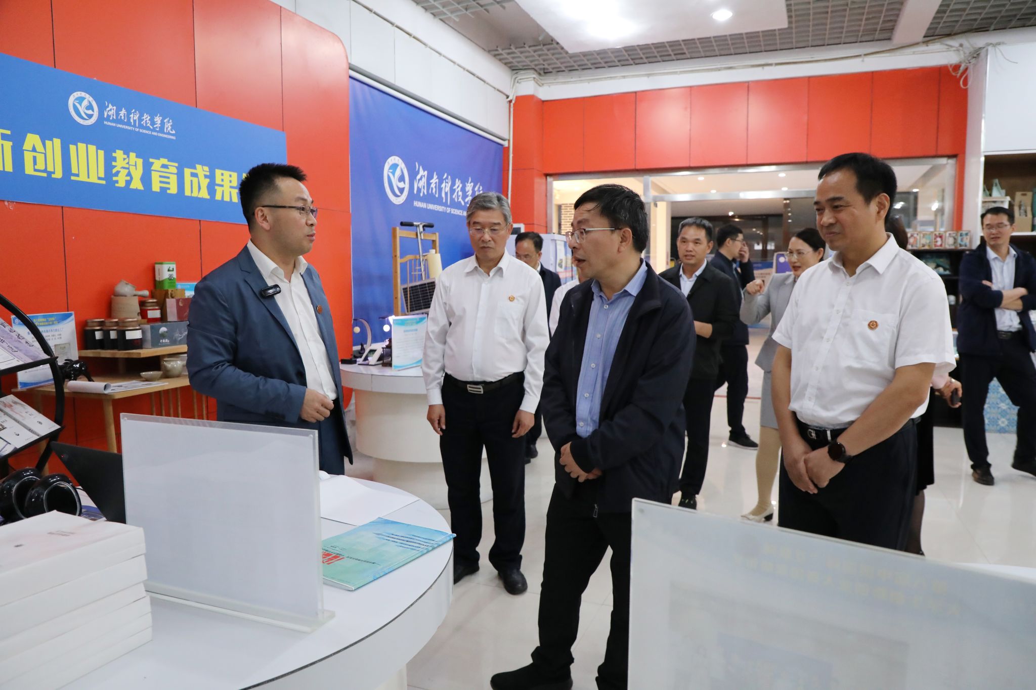赖明勇一行实地考察我校工程实训中心、航空模拟舱、砖石质文物智慧化保护利用技术湖南省重点实验室、国家级众创空间等地。黄创霞向赖明勇一行介绍了学校的历史沿革、平台建设、科学研究和人才培养等方面的情况。