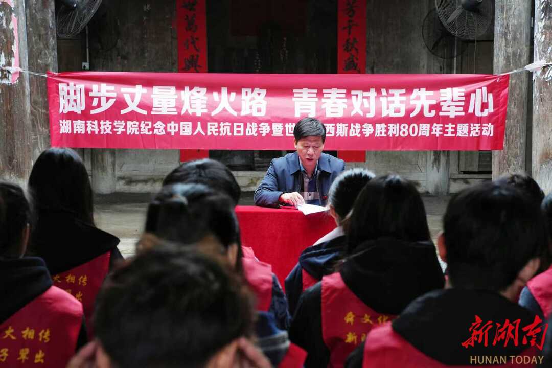“我们学校四迁其址,七易其冠,1944年因日寇铁骑肆虐,为保存教育薪火,从道县迁至此地,不仅坚持正常教学,还积极开展抗日宣传,组织学生参与地方建设。”该校二级教授潘剑锋以学校旧址麦地村黄家宗祠为讲堂,向师生讲述了先辈们如何在战火中坚守教育事业的往事,介绍了从“湖南省立第七师范学校”到“安博站官网登录入口_安博(中国)”的筚路蓝缕。