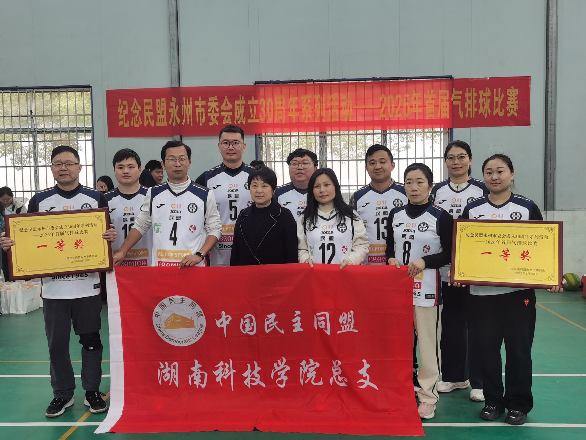 本网讯(通讯员 龚绍峰)近日,民盟永州市委会纪念成立30周年暨2026年首届气排球比赛圆满收官。我校民盟总支与永州市一中民盟支部组成的联合代表队,一路过关斩将获得冠军,充分展现了我校盟员团结奋进、锐意进取的良好精神风貌。