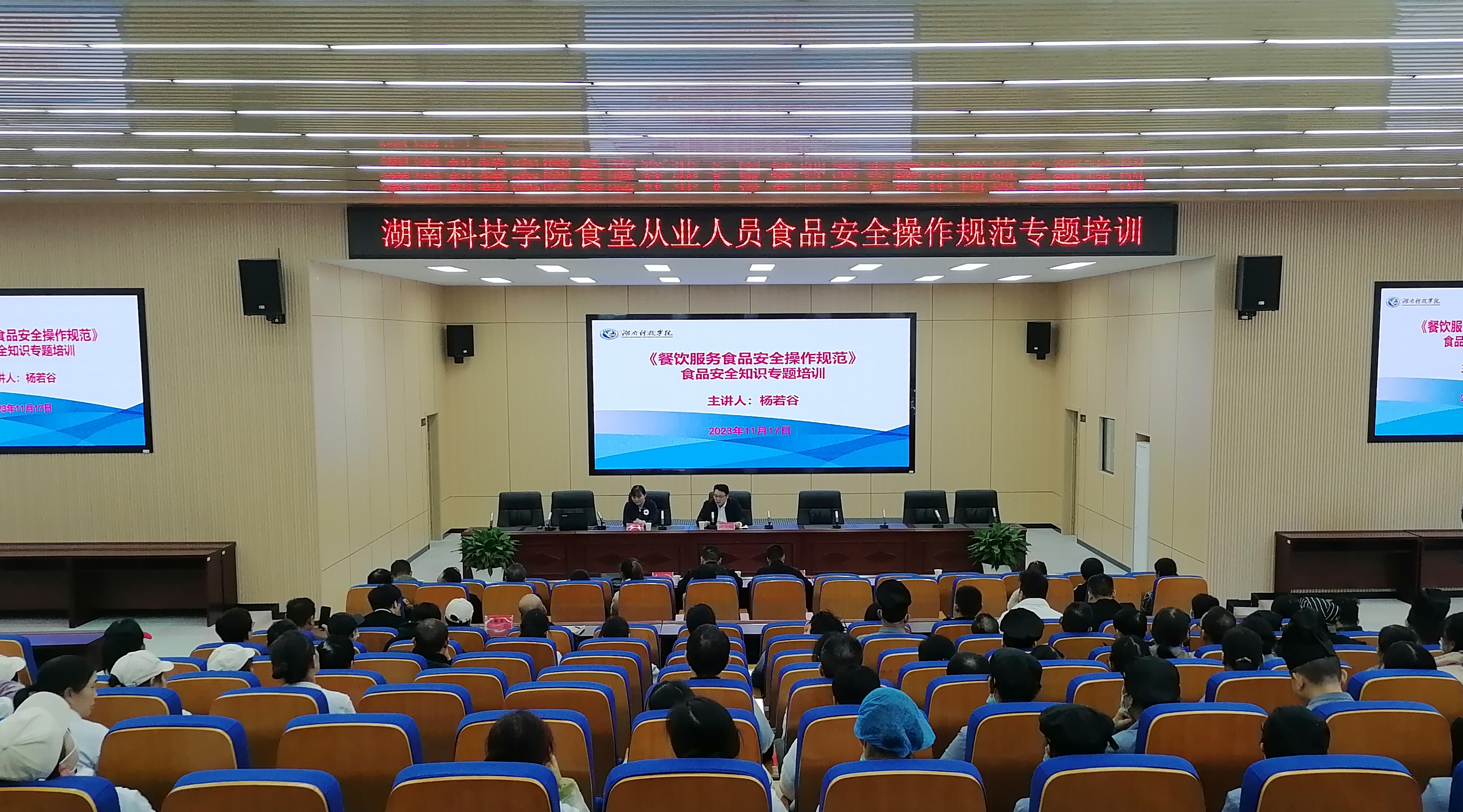 本网讯 11月17日下午,后勤服务中心邀请永州市市场监督局餐饮服务食品安全监督科科长杨若谷、零陵区市场监督管理局餐饮服务食品安全监督管理股股长胡俊文来我校开展食品安全操作规范专题培训。学校食品安全员、各食堂管理人员及食堂所有从业人员参加培训,本次培训由后勤服务中心副主任张建军主持。