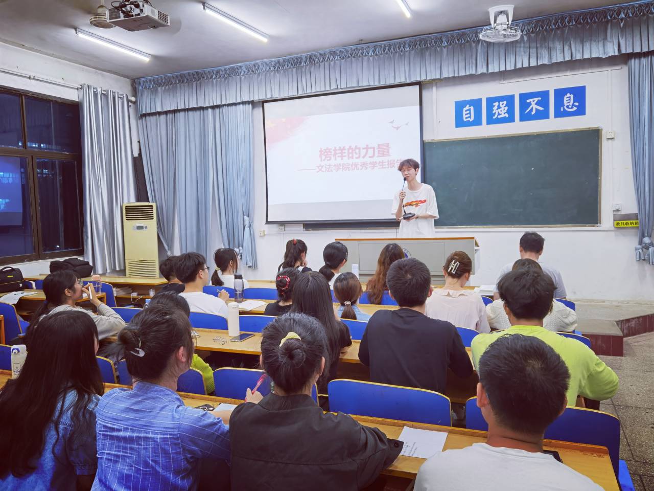 本网讯  5月27日,文法学院在明德楼406举行“榜样的力量——文法学院举行优秀学子报告会”。报告会邀请了5名优秀毕业生进行分享。该院100余名师生参加了活动。