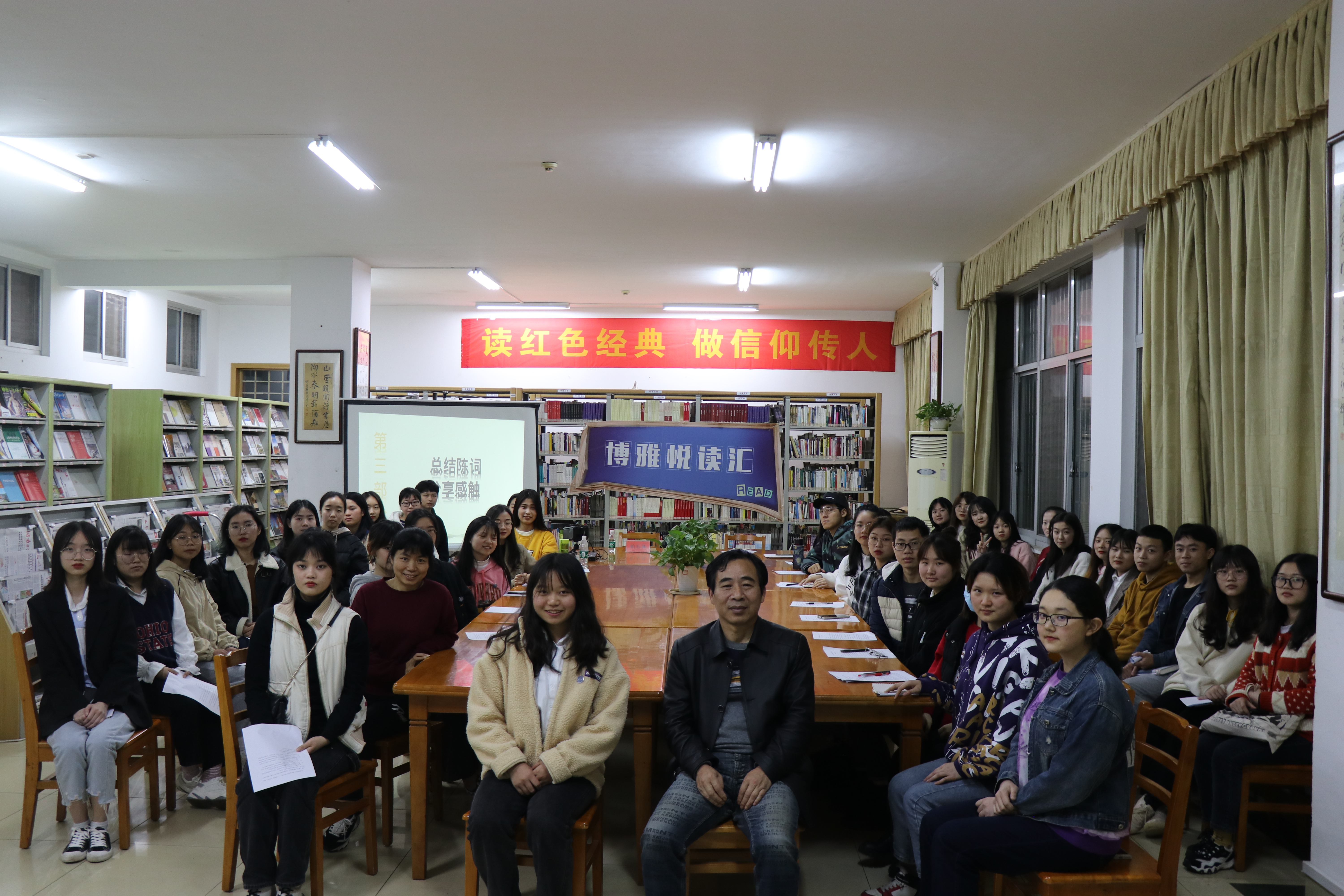 本网讯 4月16日晚,由图书馆与外国语学院共同举办的博雅悦读汇“学四史”专题第二期“学新中国史”读书沙龙在新图书馆举行,活动邀请马克思主义学院柏春林教授为大家分享经典《在庆祝中华人民共和国成立70周年大会上的讲话》,图书馆党员及40名青年学生共同参加此次活动。
