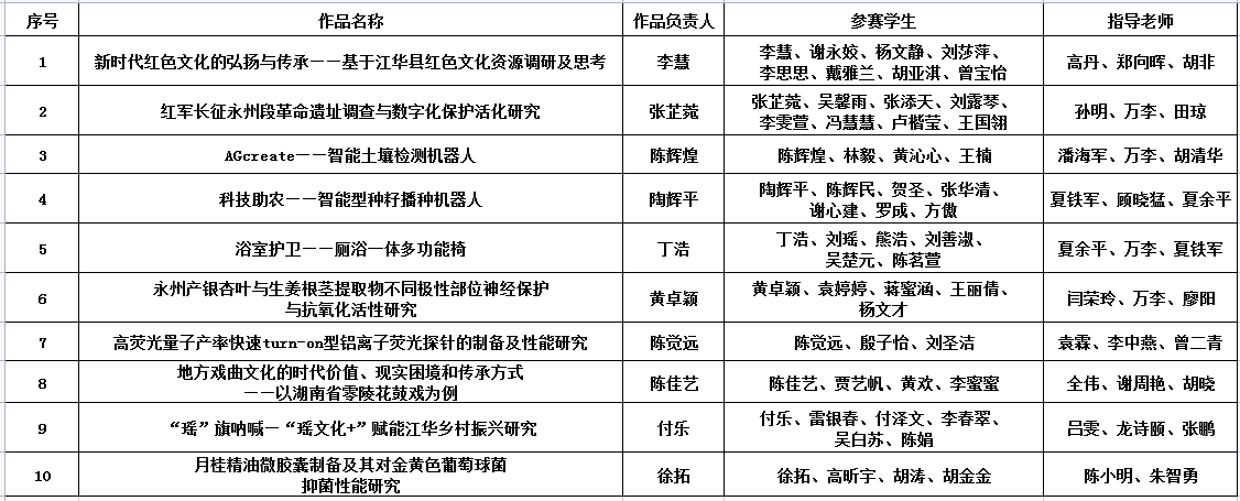 根据团省委、省教育厅、省科协、省社科院、省学联通知要求,经个人申报,学院推荐,学校评定,拟确定《新时代红色文化的弘扬与传承——基于江华县红色文化资源调研及思考》等十项作品推荐参加第十五届“挑战杯”湖南省大学生课外学术科技作品竞赛,现予以公示。时间为2023年3月30日至4月3日,如对推荐项目有异议,请于公示期内向校团委反馈,联系电话:0746-6381024。
