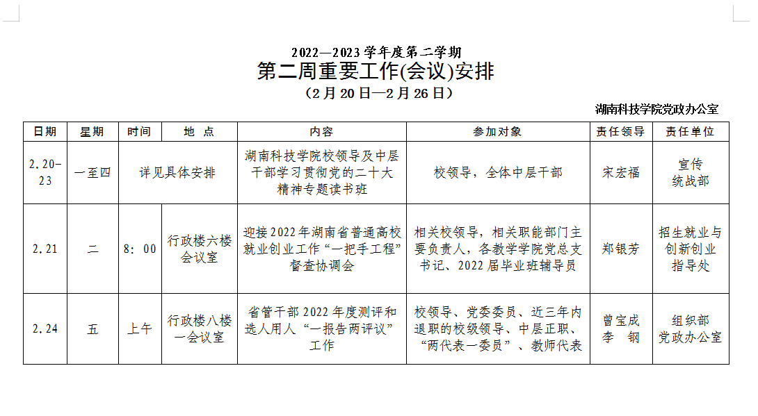 [党政办]第二周重要工作(会议)安排 (2月20日—2月26日)