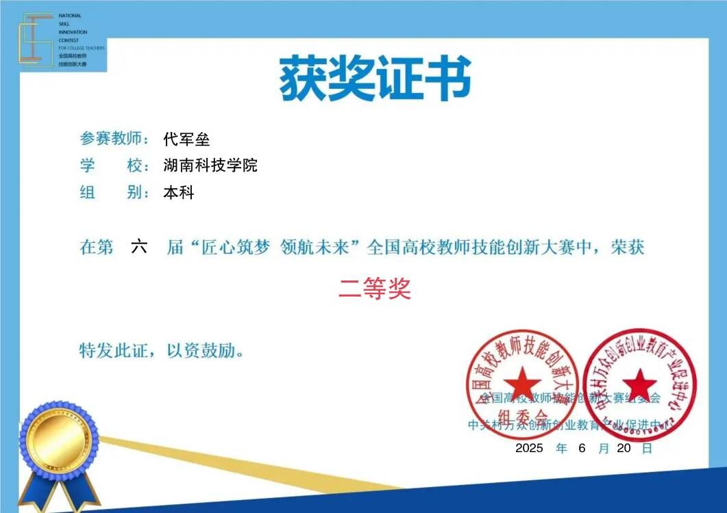 本网讯(通讯员 吴潭)近日,第六届“匠心筑梦 领航未来”全国高校教师技能创新大赛落下帷幕,我校教务处代军垒老师荣获全国二等奖。