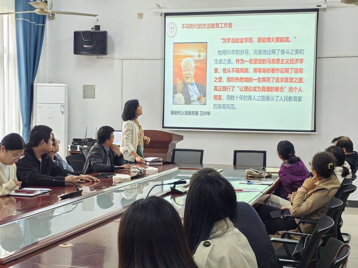 交流环节中,支部教师们积极分享感悟,林旭旭老师表示:“作为高校理科教师,既要深耕专业领域、做好科研攻关,更要以教育家精神为指引,在课堂教学中传递学科温度、在育人实践中塑造学生品格。”许宏飞老师发言:“教育家精神如同一座灯塔,其光芒由多种高贵品质汇聚而成。其中最触动我从教理想是 “乐教爱生、甘于奉献的仁爱之心”。首先必须是一个完整的、充满人情味的人。不是一个冰冷的知识权威,而是一个有热忱、有温度、有担当的生命体。我的从教理想,归根结底,是希望成为学生生命中的一个“重要他人”——不仅用知识照亮他们的前路,更用我的爱与奉献,让他们相信世界的美好与温暖,并最终将这份爱与光明传递下去。”大家一致认为,教育家精神是新时代教师成长的精神指引,未来将以更饱满的热情、更扎实的行动,践行立德树人根本任务,以实际行动诠释“为党育人、为国育才”的使命担当。