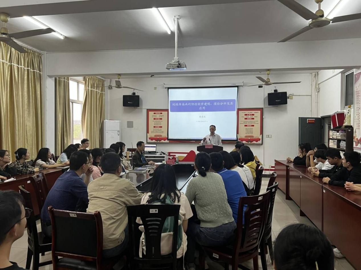 在讲座中,庾建设首先由蚊媒的生物背景以及登革热疫情讲解了蚊媒的危害,阐述了登革热症状和防控现状。接着,运用数学建模中的离散模型知识建立数学模型进行求解,让师生们知道如何在实际问题中应用模型。最后,在原有模型的推论下进行了新的数据分析以及问题讨论。在场的师生积极有序地提问和发言,整个讲座氛围十分融洽。