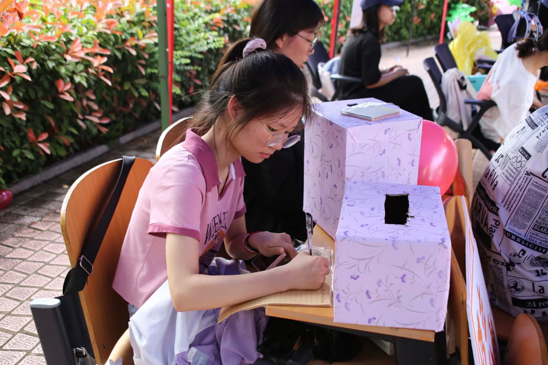 活动由五部分组成:“时光‘慢’递”、情绪收集箱、心理知识、数字游戏和“翻滚吧,乒乓球”。其中“时光‘慢’递”活动是以纸质书信形式写给未来的自己或者他人,并放入投递到“时光‘慢’递”箱,在一年后送达,通过写出自己的一些愿望和目标,激励自己更加努力拼搏,也使同学们更加认真的思考什么才是更加值得珍惜的东西。“翻滚吧,乒乓球”活动中,同学们需要将乒乓球从第一个水杯吹至第五个水杯,期间乒乓球不能从水杯中掉出,主要考验同学们平和心态、集中发力。现场的欢声笑语不断,同学们热情高涨,通过写信倾听内心声音,通过竞答提高重视,在参与的过程中收获了快乐与成长。