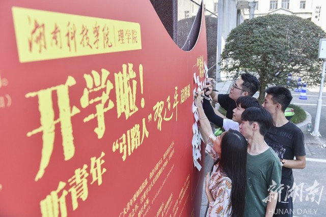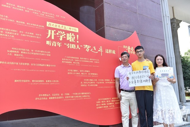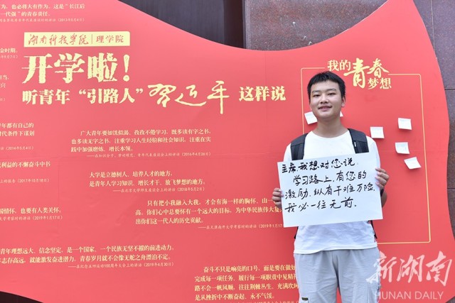 当天,是2019级新生的入学日,该校在理学院教学楼前设立了主题为“开学啦!听青年‘引路人’习近平这样说”的展板,用习主席对青年的寄语来勉励2019级入学的新生,新生们纷纷拿起笔写下“开学日,我想对主席说”的一系列话语,以此来回应习主席对青年的寄语。