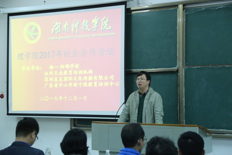 本网讯(通讯员芮沈喆刘罗)为了进一步加强学院与企业之间的沟通和交流,开阔毕业生的就业思路,我院于12月1日晚7点在明理楼402教室举行2017年校企合作论坛。永州天成教育培训机构、深圳友友国际文化传播有限公司、广东省中山市新干线教育培训中心、湘一·阳明学校等四家企业代表以及我院大三、大四师范生代表参加了此次论坛,会议由学院党总支书记陈旭日主持,学院党总支副书记唐卫华、学工办主任刘铮、毕业班辅导员刘罗共同出席。