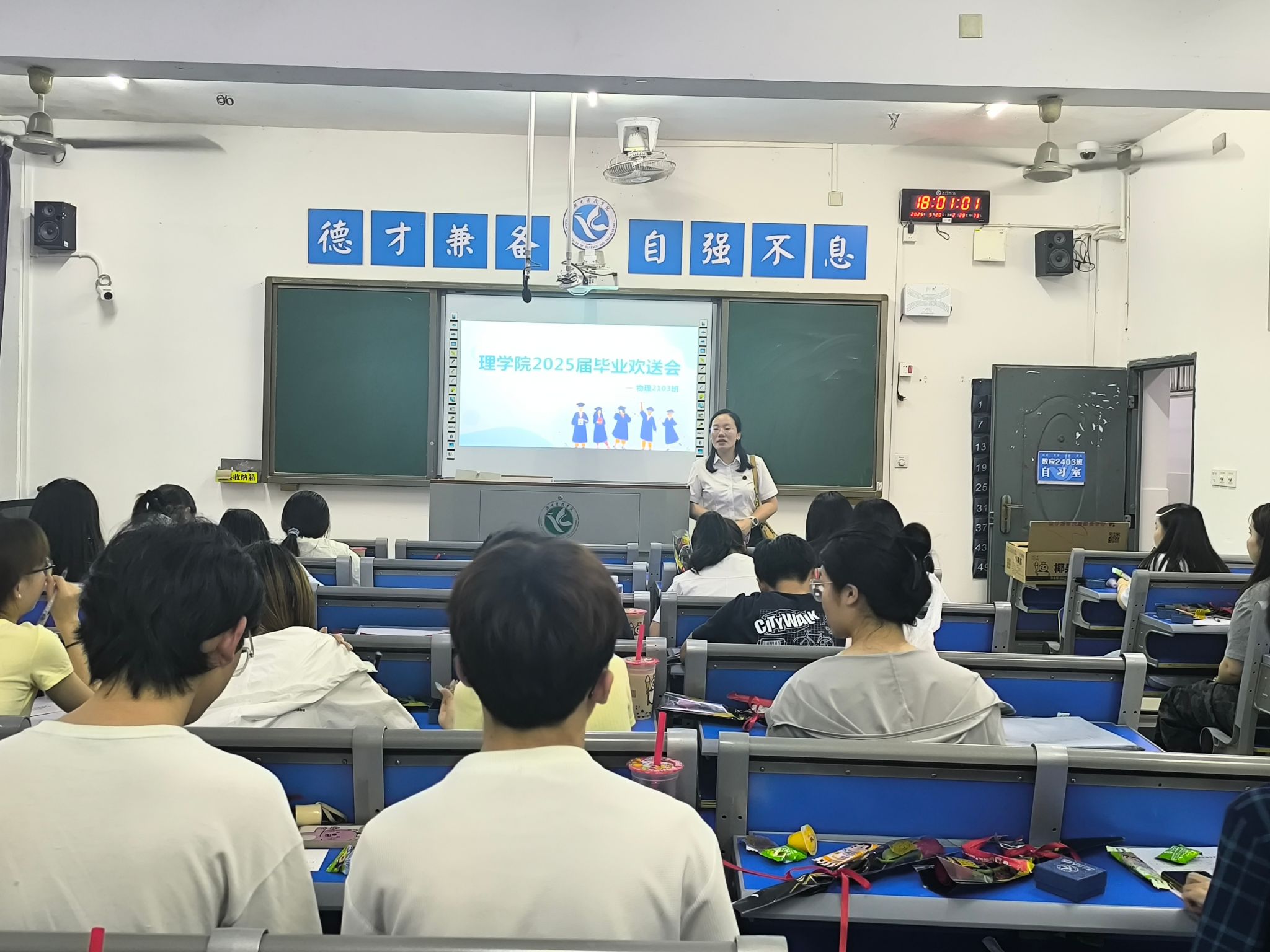 欢送会伊始,一段精心制作的毕业生祝福视频拉开序幕。老师们一改常态,摇身一变“土味情话”男女主角,“老师你去干啥?我去上课啊,喜欢你们的时时刻刻”“老师您早上吃的啥?我喝的粥,想你们的每一周”等幽默金句引发阵阵欢笑,将四年点滴化作会心一笑的温暖回忆。理学院院长以“三个坚守”勉励学子:坚守诚信本分的立身之本,坚守社会责任的担当之志,坚守终身学习的进取之心,祝福理学院2025届全体毕业生以梦为舟,乘风破浪;以理为帆,直济沧海。毕业生代表物理2103班颜芳萍在发言中细数成长印记:疫情期间师生共同打造的“疫剪没”解决学生的“头等大事”,理学院篮球队勇夺桂冠的激情时刻,串联起独属于理院学子的青春叙事。在离校事项布置环节,龙枚樱通过清晰表格解读手续办理流程,让数据多“跑路”,同学们少跑腿,打通毕业生离校的最后一公里。