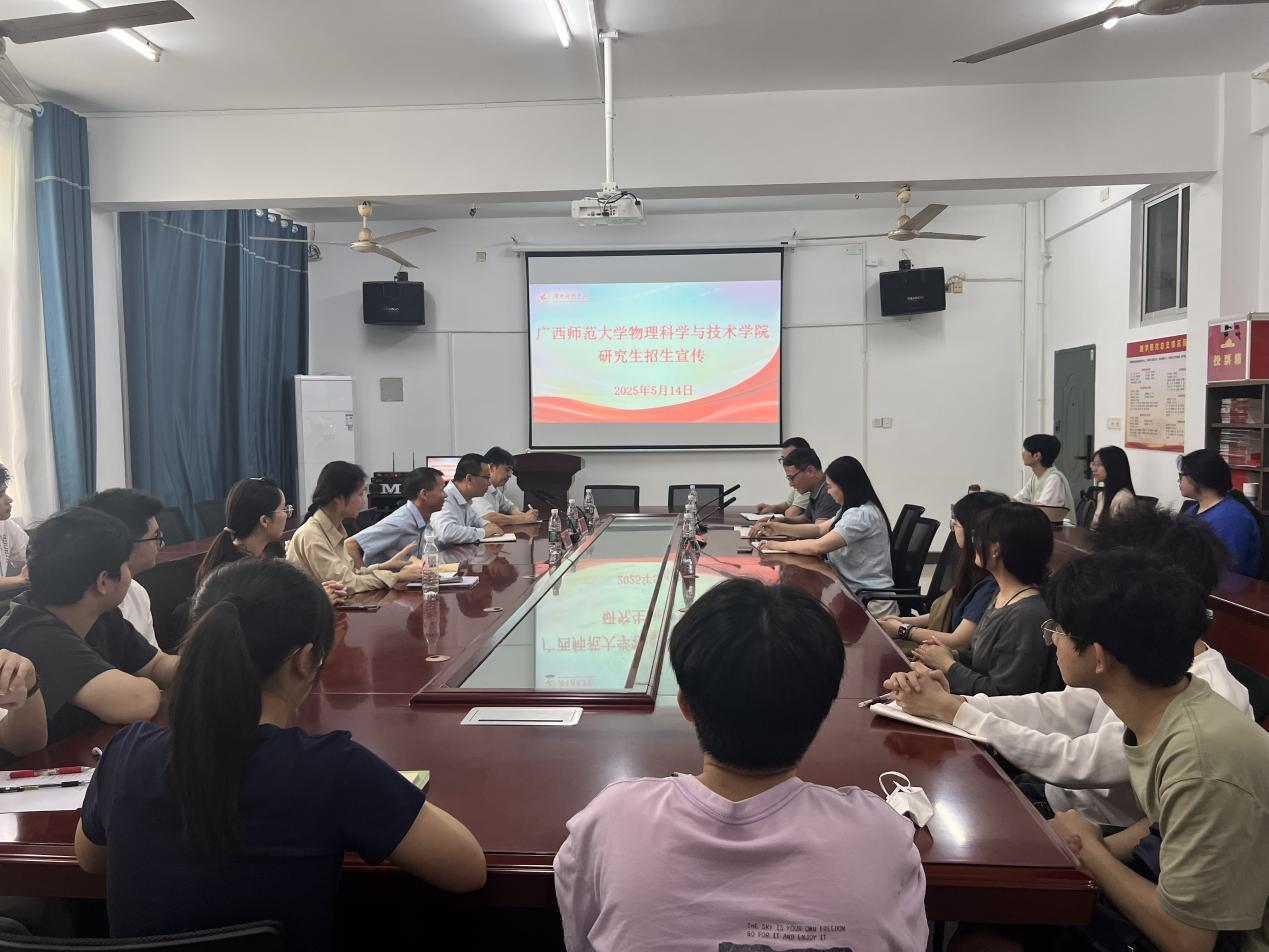 本网讯(通讯员:刘静)为深入落实新时代人才选拔培养工作要求,充分发挥高校协同育人作用,进一步帮助22级考研学生做好考研规划,理学院于2025年5月14日上午在明理楼313会议室开展广西师范大学研究生招生宣讲会。广西师范大学杜亮教授、王海教授、高忠贵副教授,理学院副院长吴清华、党总支副书记欧阳素勤、理学院部分教师以及22级物理学专业部分学生参加了本次宣讲会。