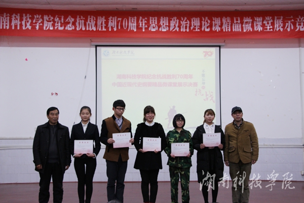 本网讯(记者 皮妍)“浩气贯长虹,激情颂先烈”,为纪念抗战胜利70周年,进一步推动思想政治理论课教学改革,12月13日晚,马克思主义学院《中国近现代史纲要》教学部在博雅楼东三教室,举行以“品评抗战历史人物,讲述抗战历史事迹,反思抗战历史得失”为主题的纪念抗战胜利70周年思想政治理论课精品微课堂展示决赛。