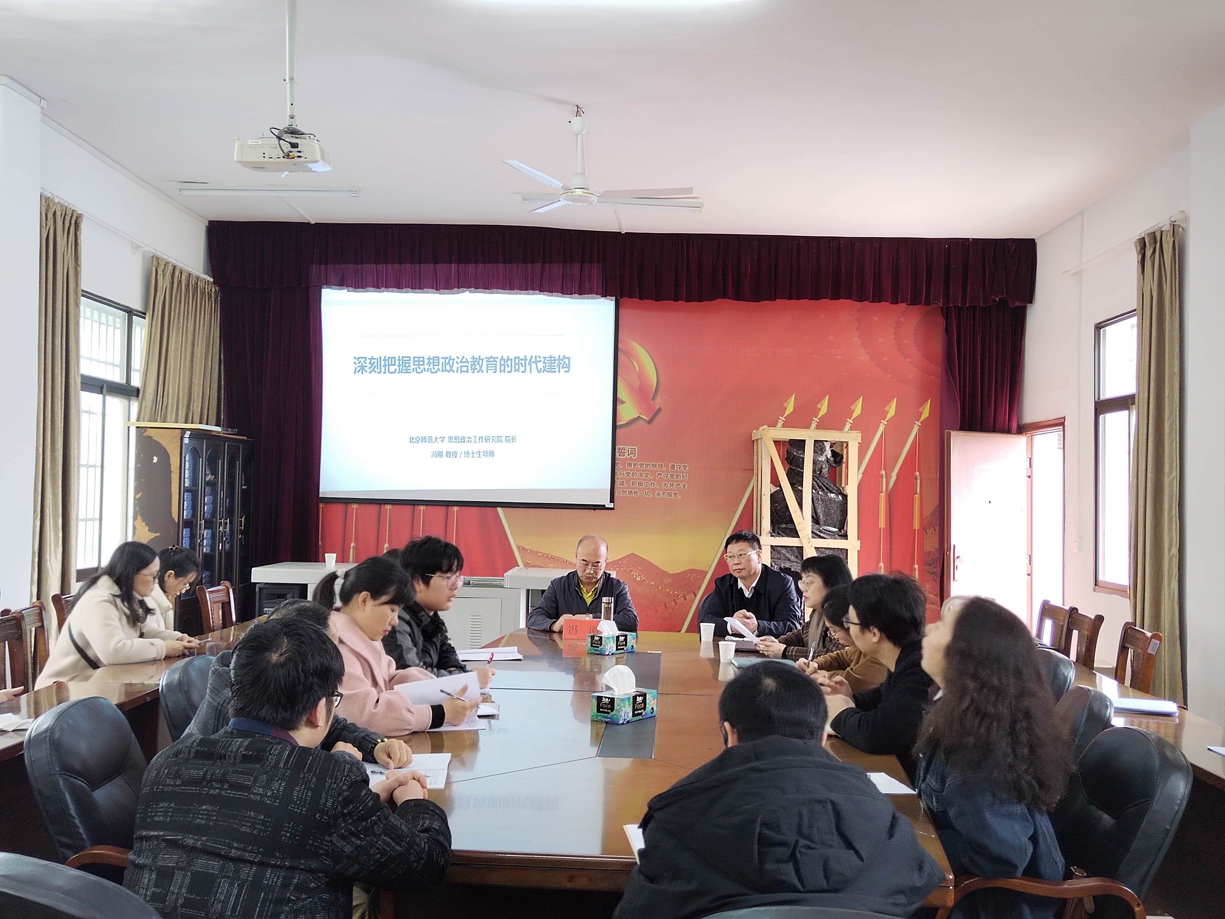 (本网讯 胡非)4月24日上午,原教育部思想政治教育工作司司长,现北京师范大学思想政治工作研究院院长,博士生导师冯刚教授应邀在马克思主义学院405会议室开展主题为“深刻把握思想政治教育的时代建构”的专题讲座。学院教师到场聆听学习,院长廖雅琴教授主持讲座。