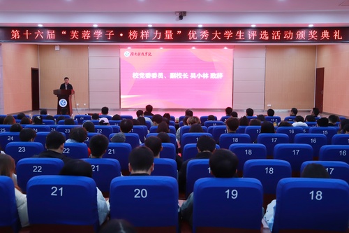 本网讯(记者 龙雨帆 张艾琳)时代呼唤英才,榜样引领未来。11月30日晚,我校第十六届“芙蓉学子·榜样力量”优秀大学生颁奖典礼在潇湘大讲堂隆重举行。校党委委员、副校长吴小林,湖南中烟工业有限责任公司营销中心湖南销区永州业务经理李小伍,党委学生工作部部长唐华山,校团委书记万李等出席典礼。各教学学院党总支副书记、团总支书记及第六期大骨干培训班全体学员共800余人参加活动。