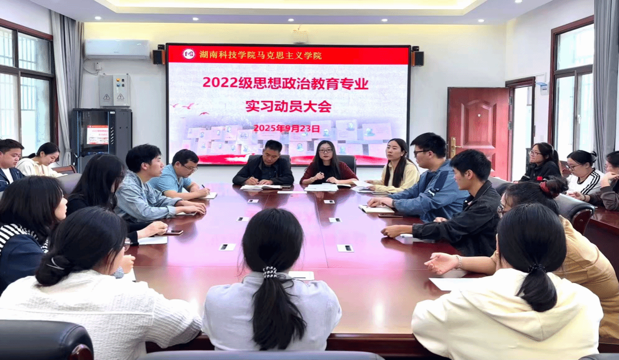 本网讯(通讯员 唐立为深入贯彻落实立德树人根本任务,扎实推动思想政治教育专业实践教学高质量发展,引导学生坚定理想信念、提升专业能力,2025年9月23日,马克思主义学院在鹤鸣楼405会议室召开2022级思想政治教育专业实习动员大会。学院党总支书记高丹、副院长唐立、思想政治教育系主任符小勇、2022级思政专业班主任黄丽及全体2022级学生参会。会议由唐立主持。
