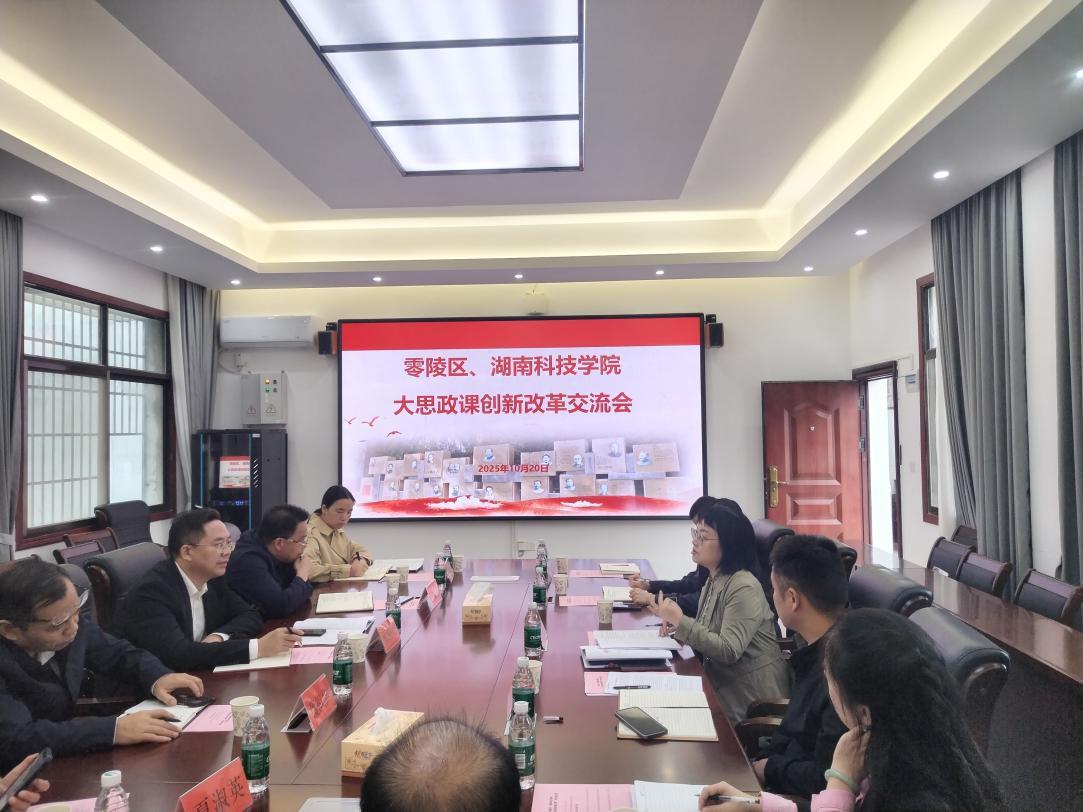 10月20日,安博站官网登录入口_安博(中国)、零陵区“大思政课”创新改革交流会在我院鹤鸣楼405会议室召开。零陵区区委办常务副主任蒋国荣一行,安博站官网登录入口_安博(中国)马克思主义学院院长廖雅琴、党总支书记高丹、副院长唐立及学院教师代表参会,双方围绕协同推进“大思政课”创新改革进行交流。