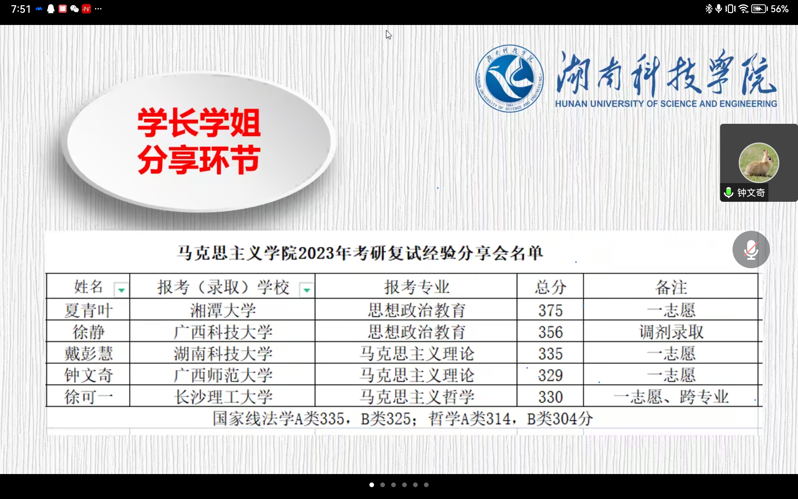 本网讯(记者 唐汇)为促进我院考研学子更好地了解考研复试内容与调剂流程、掌握面试技巧,3月13日晚,我院特举办2023年考研复试经验线上交流会 ,此次活动特邀徐静、夏青叶、戴彭慧、钟文奇、徐可一5名优秀的研究生学长学姐,进行经验分享与交流。马克思主义学院党总支副书记高丹与思政1902班班主任陈猛受邀参加线上会议,会议由辅导员老师曹惠如主持。