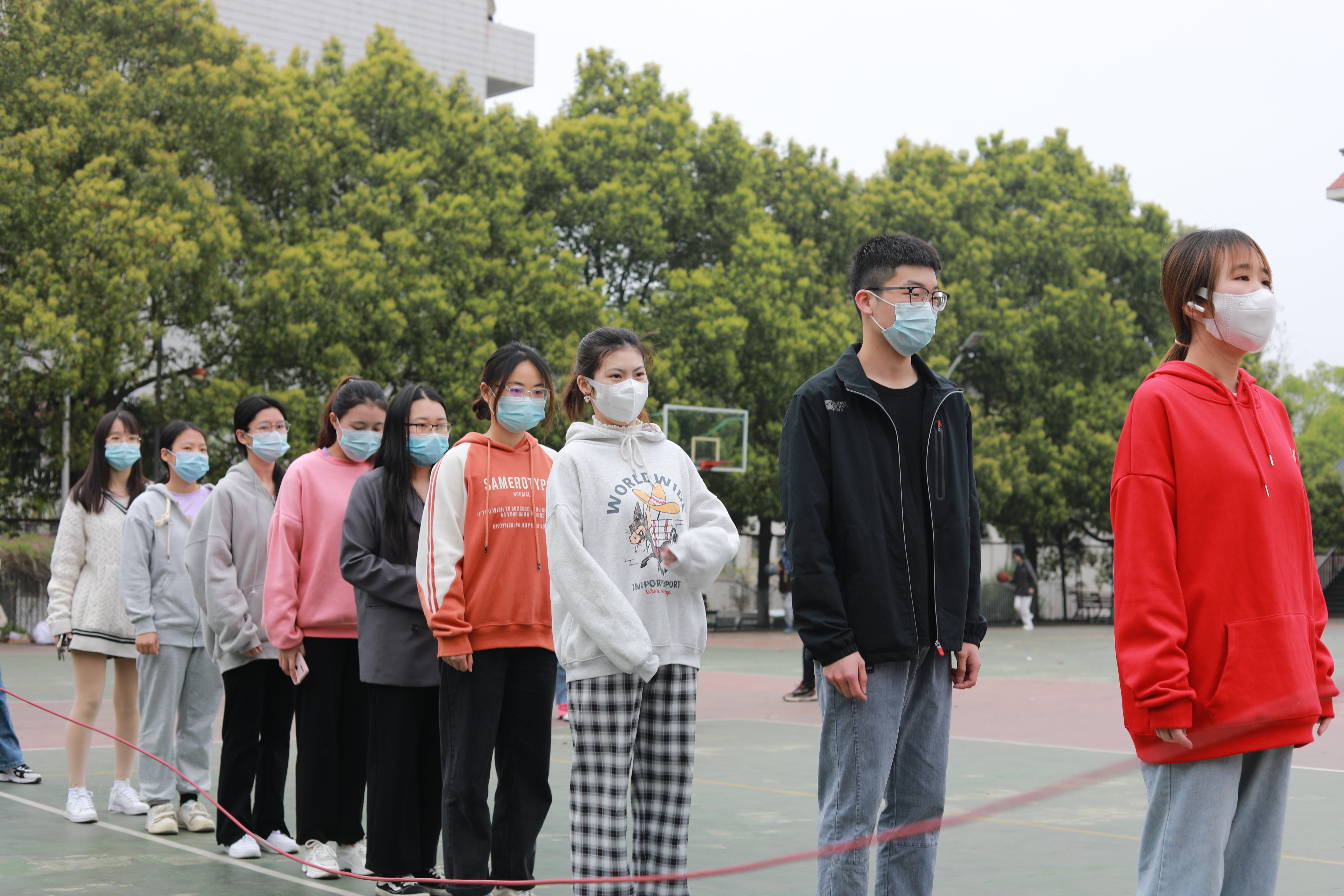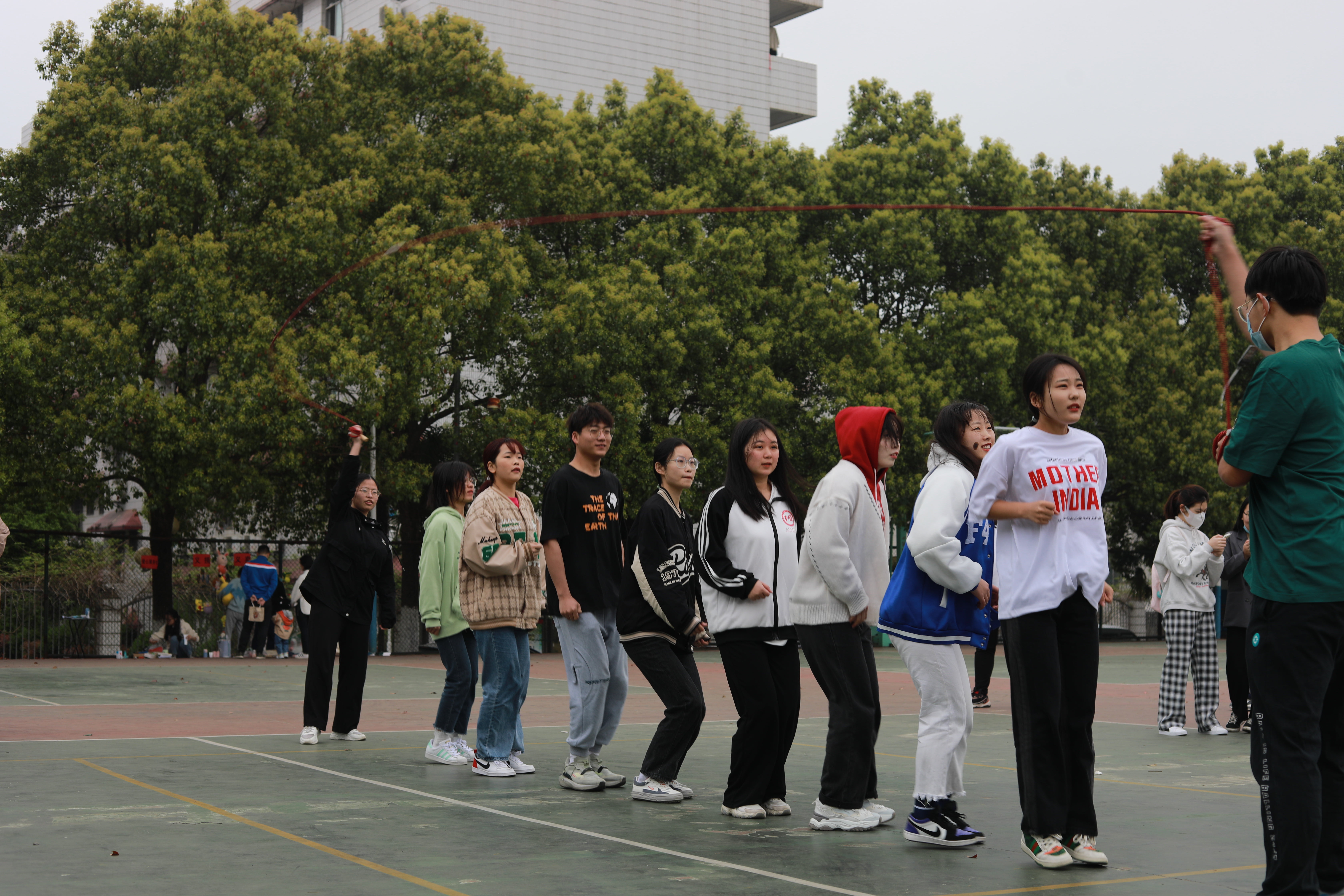 比赛主要面向大一、大二学生开展,以班级为单位,每班至少10名参赛队员,其中2名为摇绳员,比赛时间2分钟,参赛队员集体站在绳子的同一侧双脚跳动,以跳绳总个数来判定最终成绩。