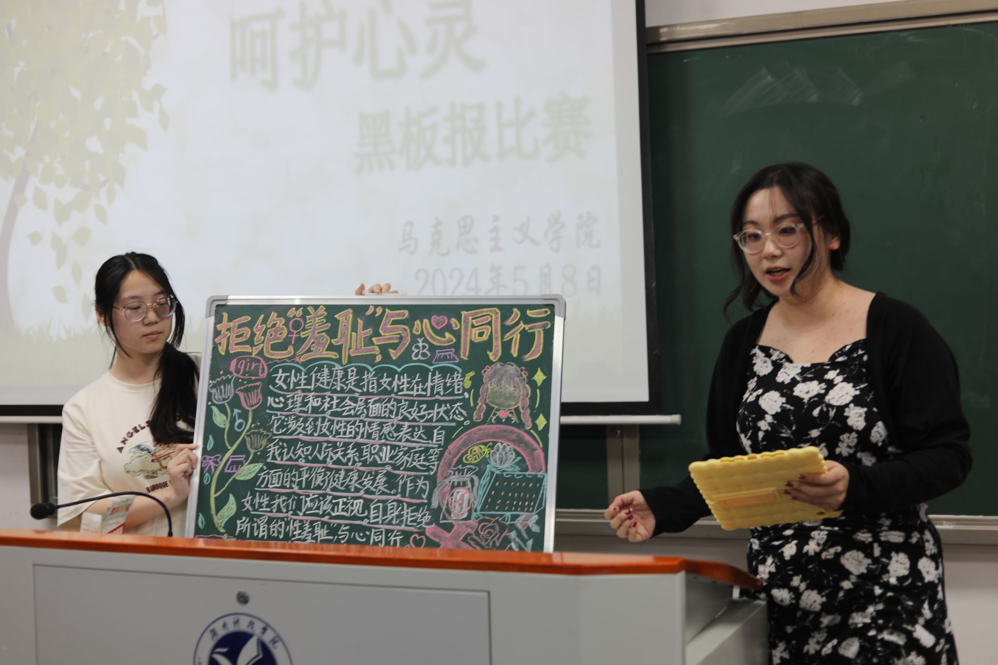 活动伊始,主持人为同学们讲解心理健康的重要性并分享一系列实用的日常心理健康维护方法。紧接着,各参赛队伍的代表们纷纷登台,以图文并茂的黑板报形式,展现独特的创作理念和心理健康见解。