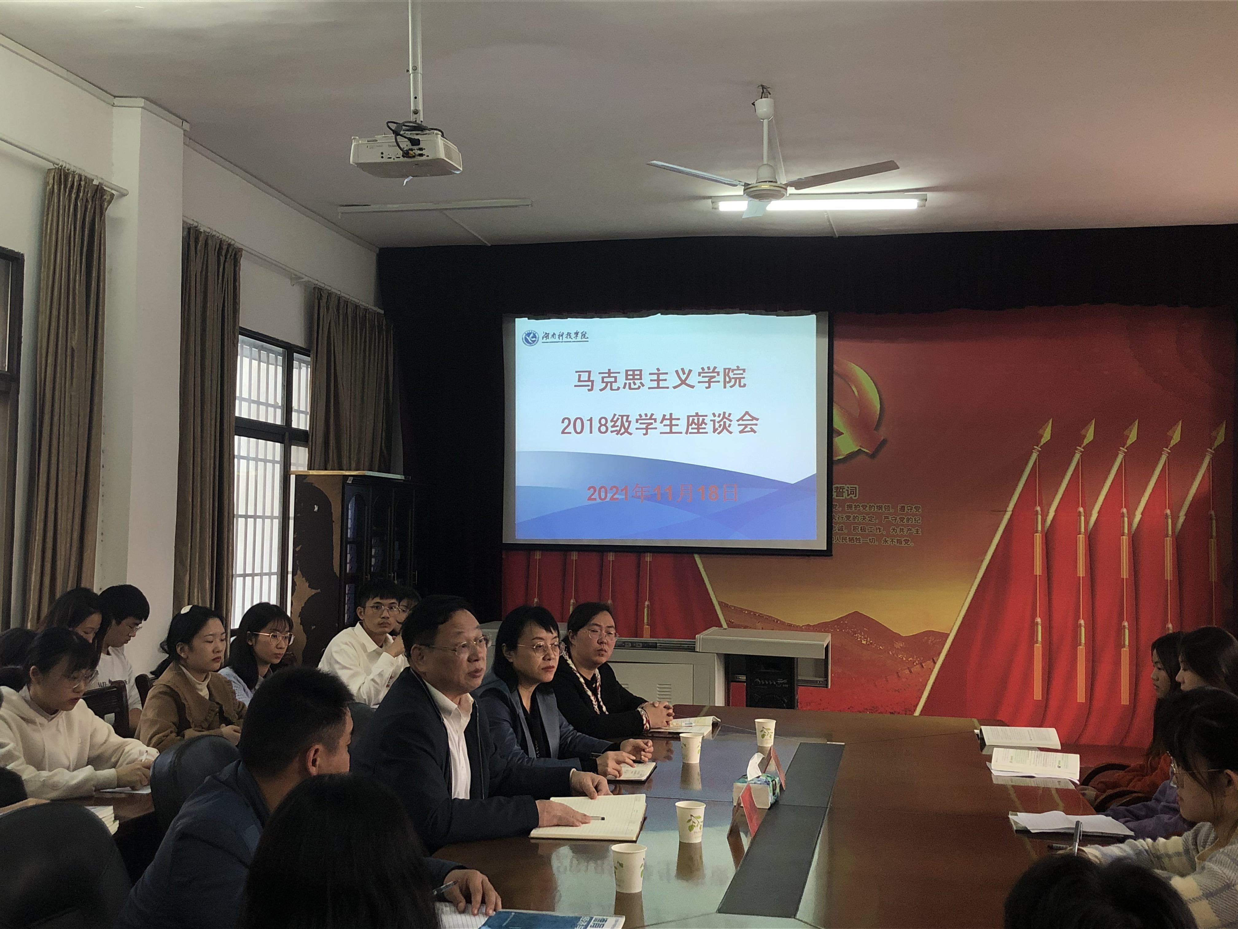 本网讯(记者 王婧)为有效调整2018级学生考前心态,坚定其自身考研目标。11月18日,马克思主义学院鹤鸣楼405教室召开2018级学生座谈会。本次会议由学工办主任王君主持,校学工部部长唐华山、马克思主义学院院长廖雅琴、党总支副书记兼副院长高丹出席,马克思主义学院2018级学生参加本次座谈会。