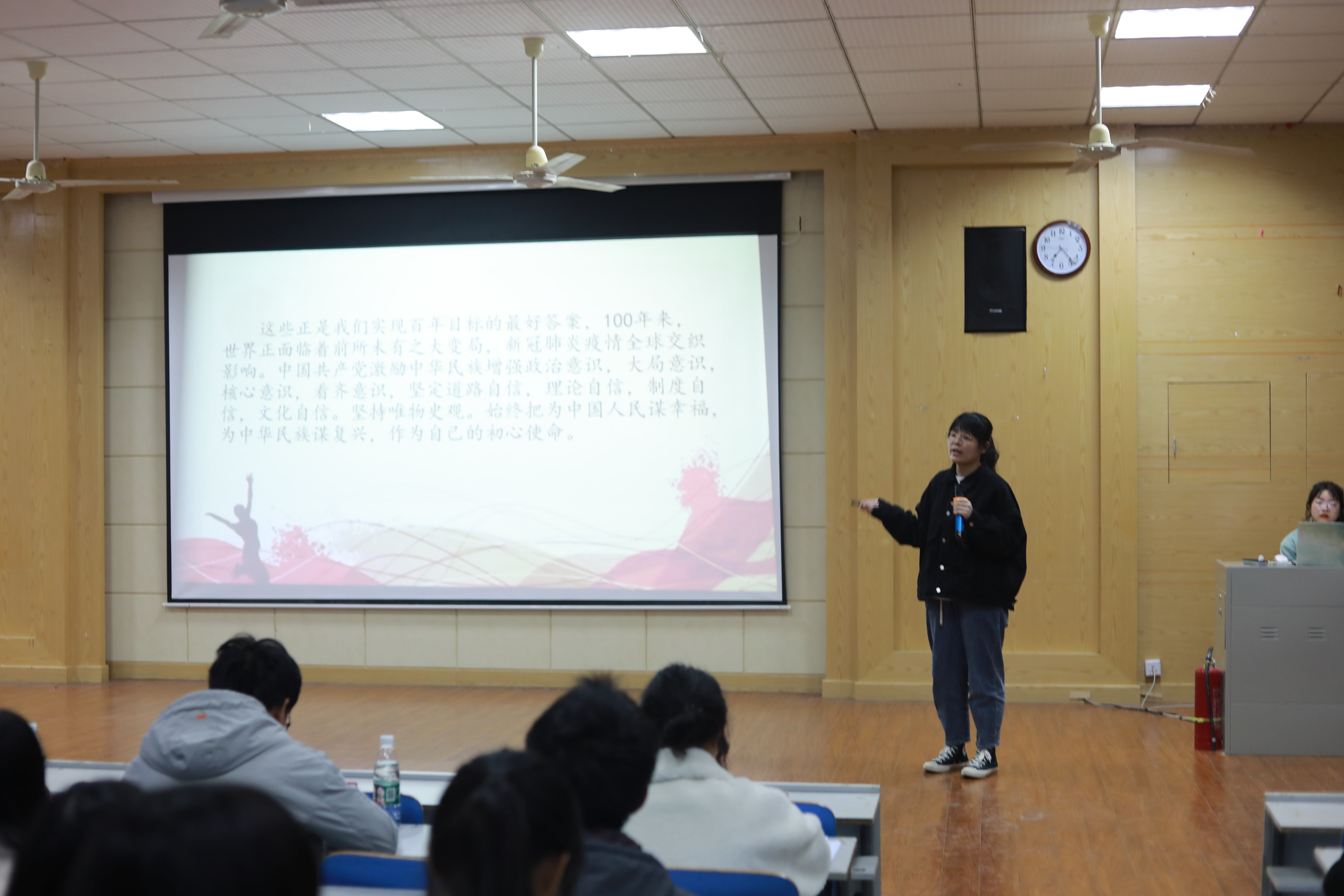 “新时代的中国青年要以实现中华民族伟大复兴为己任,增强做中国人的志气、骨气、底气。”百年目标队以“学习全会精神,争做青年脊梁”为主题,举陈延年烈士与陈乔年烈士的英雄事迹激励新时代青年要担当有为;照亮夜航队分别从昨天、今天、明天三个方面讲述党带领全国人民奋勇向前,提到了新冠疫情期间我国社会主义制度的优越性;“要牢记一个根本性问题、两个确立、马克思主义中国化三次伟大飞跃。”星星之火队用数字“一二三”视角,讲述了自己对十九届六中全会的主要内容的理解,呼吁思政学子在日后要不断砥砺奋进。