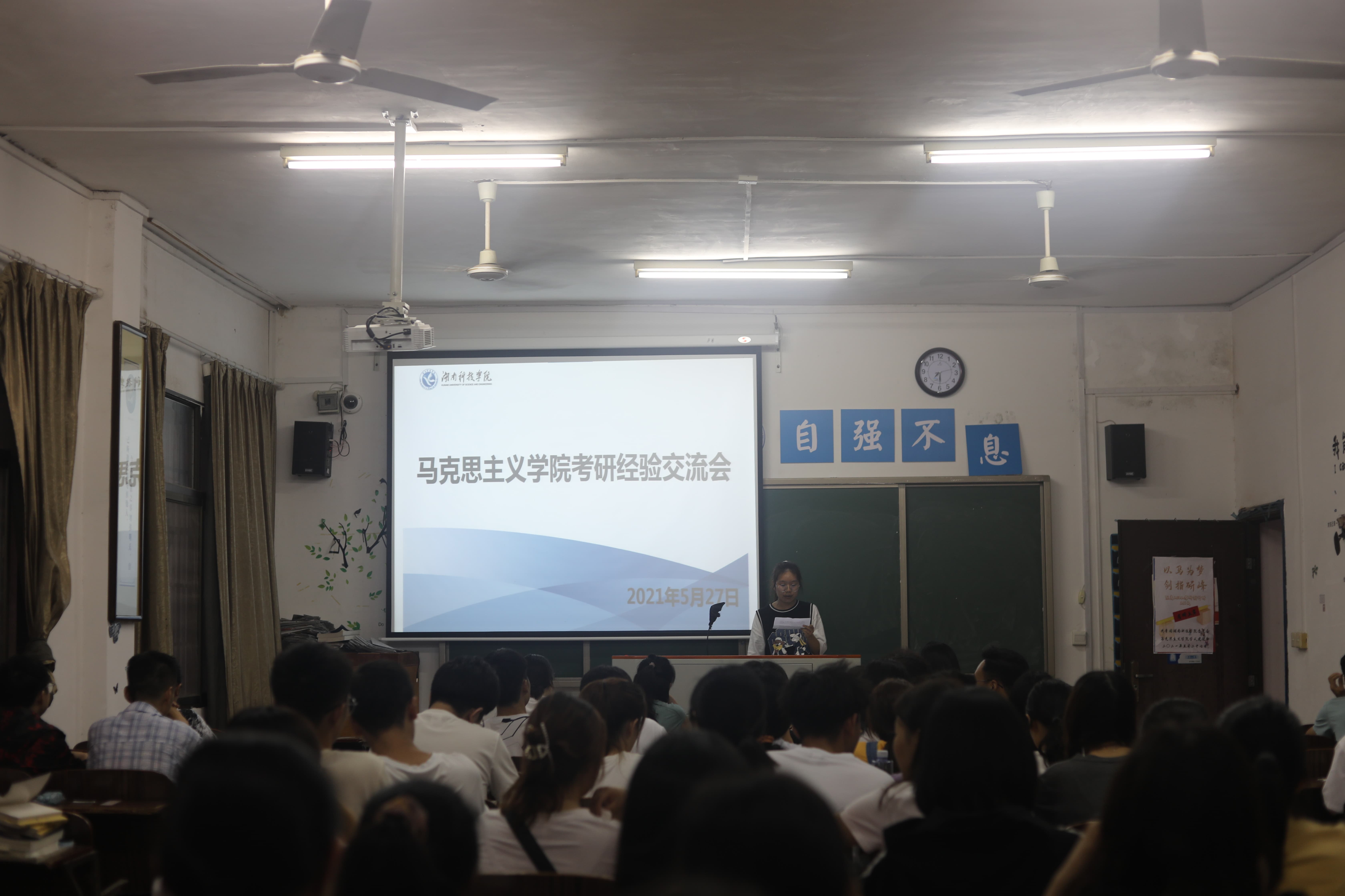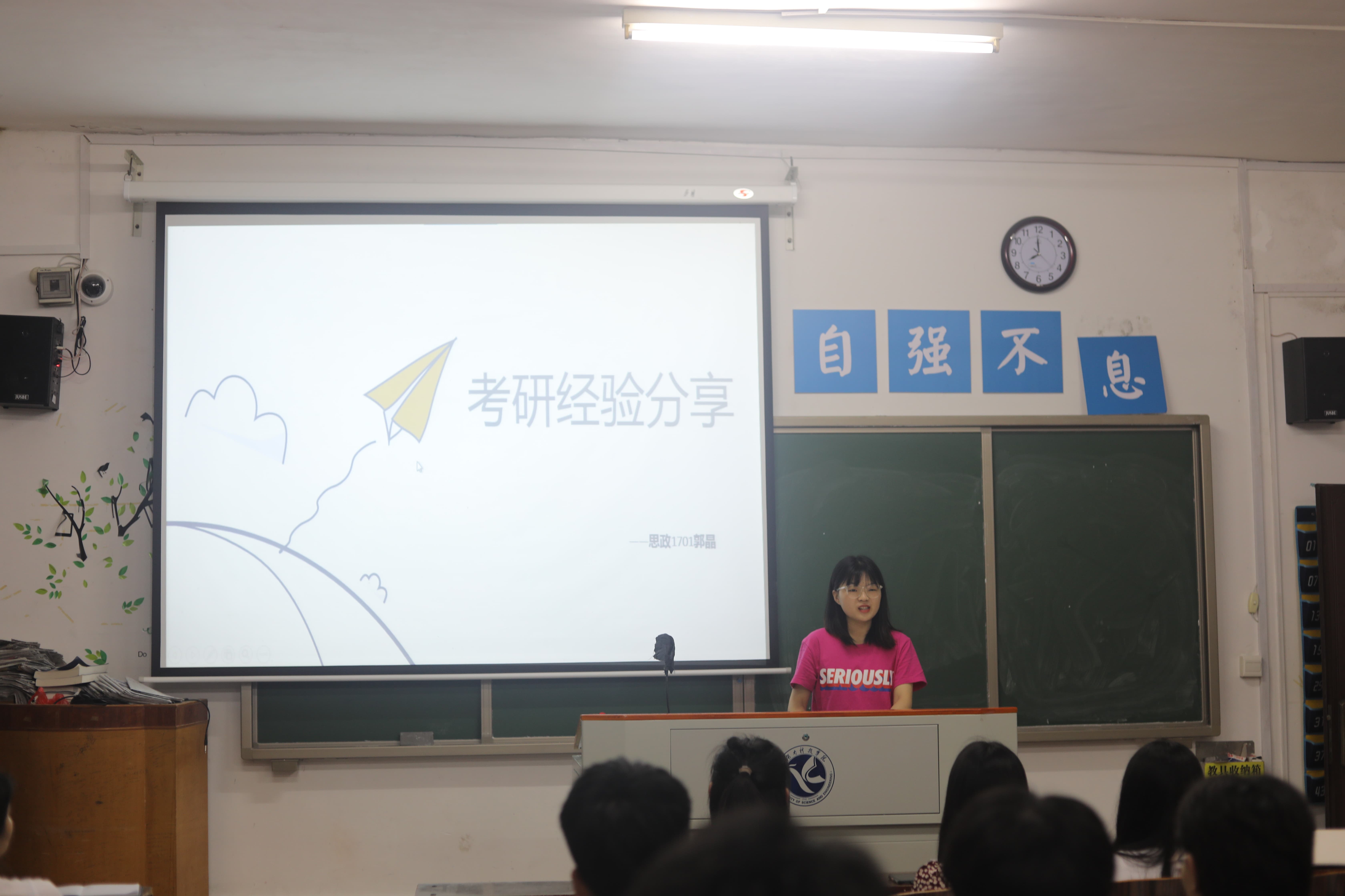 本网讯(通讯员 王华炜)为进一步激发同学们的考研热情,帮助同学们了解更多考研信息,掌握相关考研技巧,马克思主义学院于5月27日晚在鹤鸣楼501教室举办了“以马为梦,剑指研峰”考研经验交流会。