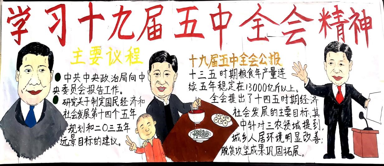 同学们先是对十九届五中全会精神的重要意义作了认真的理论解读,同时,响应当下“制止餐饮浪费”的号召,选择突出“三农”主题进行绘制;和蔼可亲的习大大人物设计则是根据“习近平漫画形象”进行了模仿和创新。