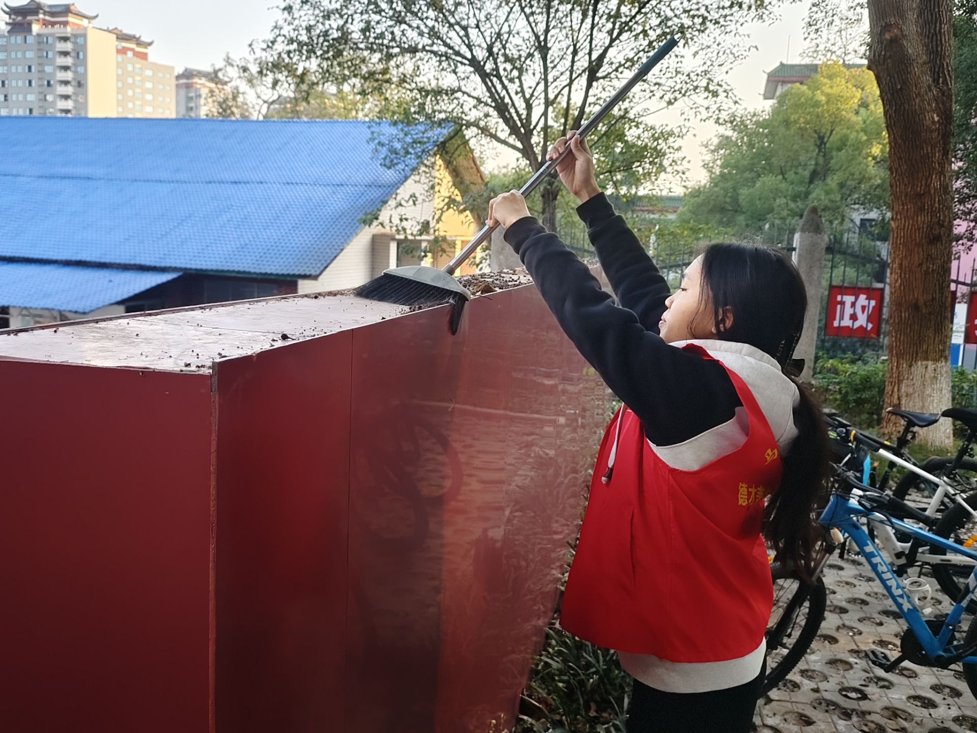 在活动中,各卫生区域负责人认真督促;志愿者分工明确、共同协作,将杂物一一归置。同时,他们还将绿化带的果皮纸屑及白色垃圾清扫干净,对教学楼及红色书屋进行了全面细致的清洁。