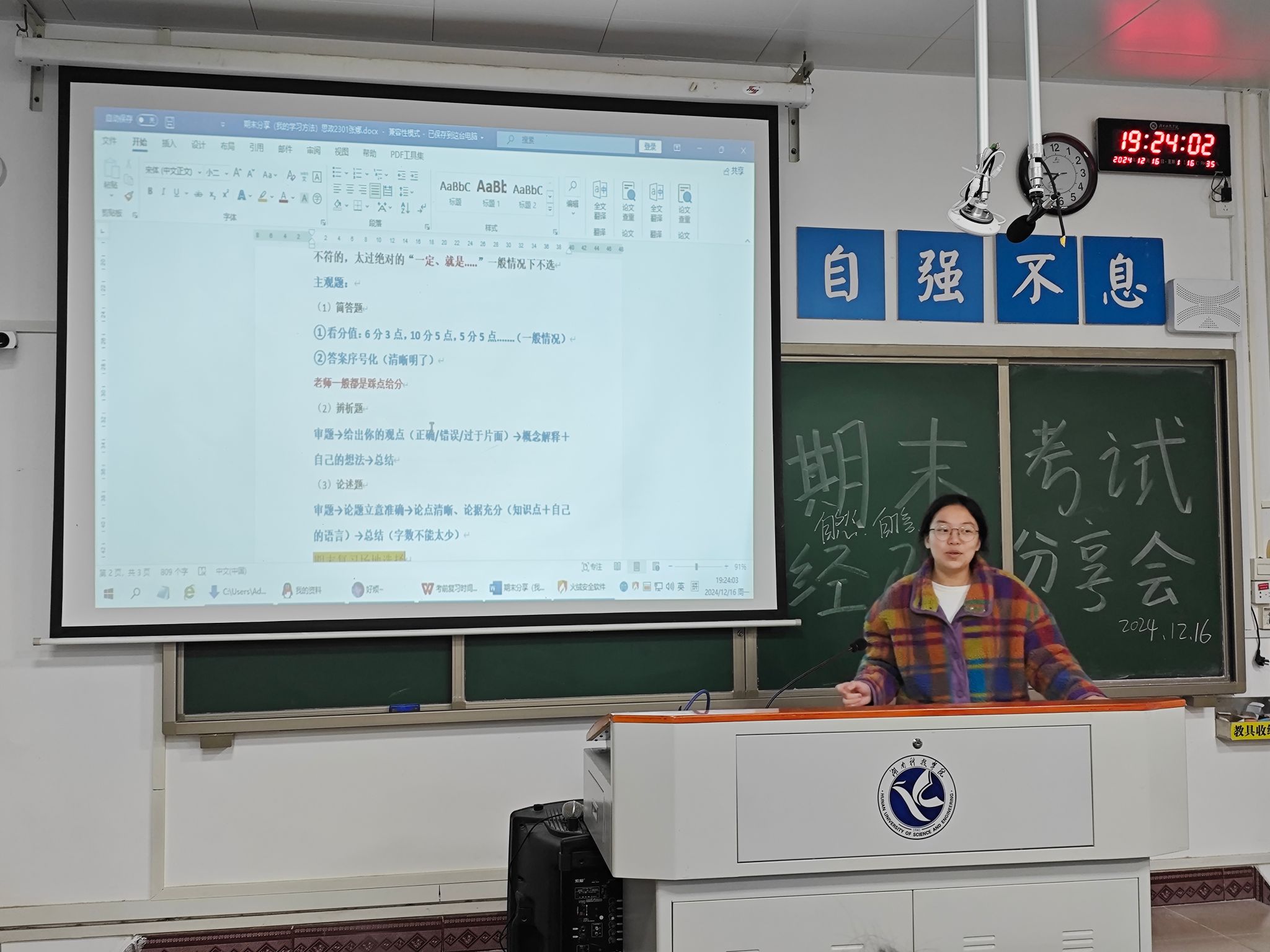 本网讯(记者 李嘉瑶 郭瑞)为进一步推动学院学风建设,帮助大一新生更好掌握复习技巧。12月16日晚,马克思主义学院于鹤鸣楼501教室举办期末经验分享会,本次活动邀请了23级优秀学长学姐进行经验分享,24级全体学生参加。