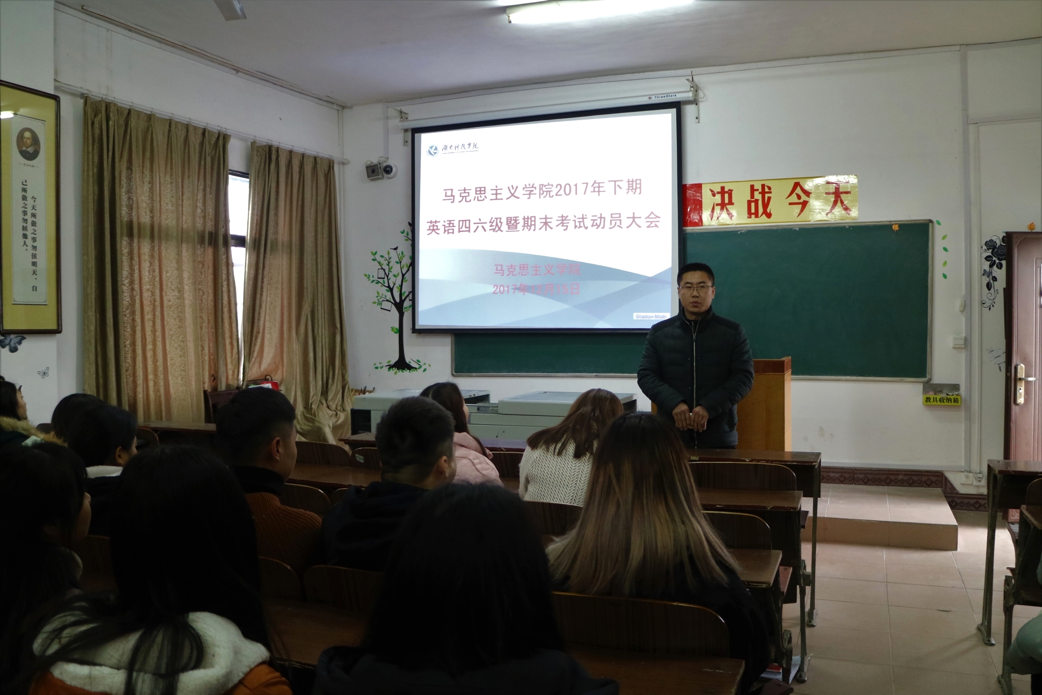 本网讯(通讯员 彭超)为严肃考风考纪,鼓舞学生士气,交流考试经验。我院于12月15日下午在鹤鸣楼501教室举行英语四六级暨期末考试动员大会。大一、大二、大三学生聆听会议。马克思主义学院党总支副书记兼副院长李观求老师,马克思主义学院学工办主任全伟老师参与本次会议。