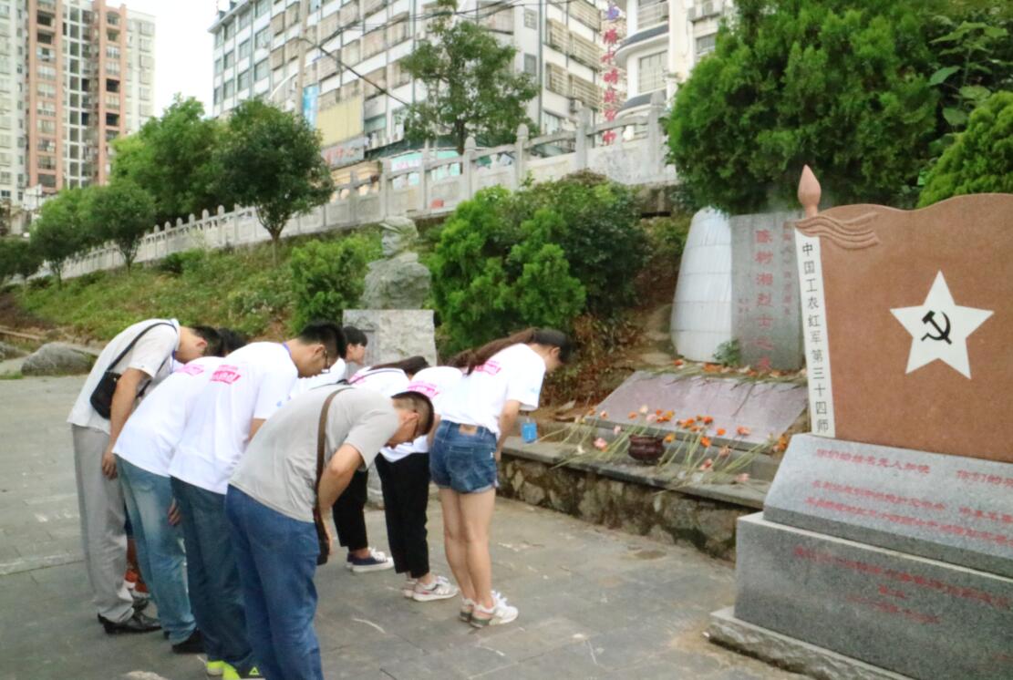 随后,志愿者们来到了红军三十四师师长陈树湘烈士的陵墓前。在冲击敌人火防网不幸受伤,后被道县保安团第一营何汉部抓获,陈树湘乘敌不备用手从伤口处伸入腹部,抠出肠子,大叫一声扯断了肠子,壮烈牺牲,时年29岁。