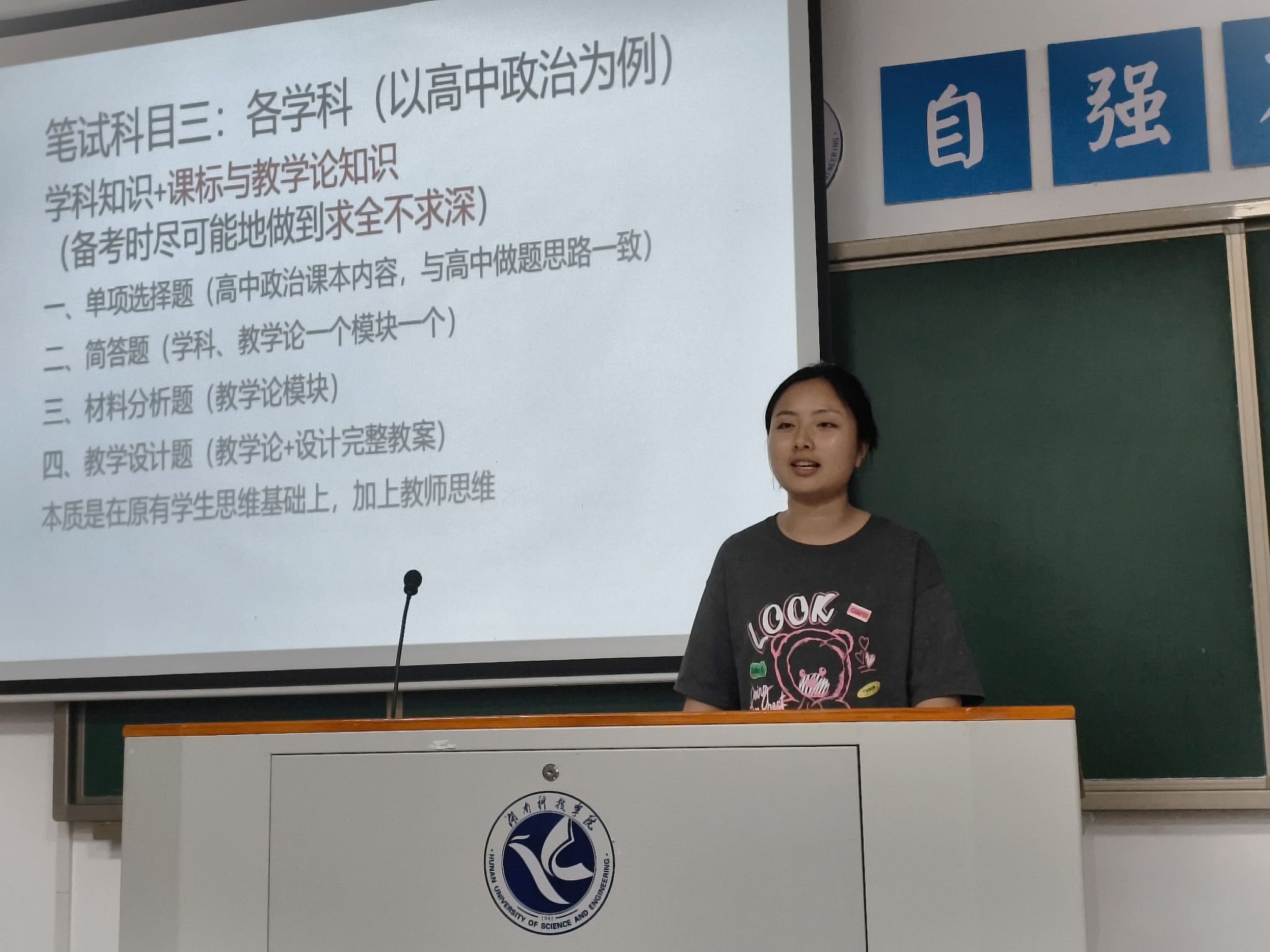 本网讯(记者 唐淼淼 李嘉瑶)为助力我院学子高效备考教师资格证,马克思主义学院于5月22日在鹤鸣楼501教室举办教资考试经验分享会。本次分享会邀请了我院6名已通过教资考试的优秀学生代表,现场学习氛围浓厚。