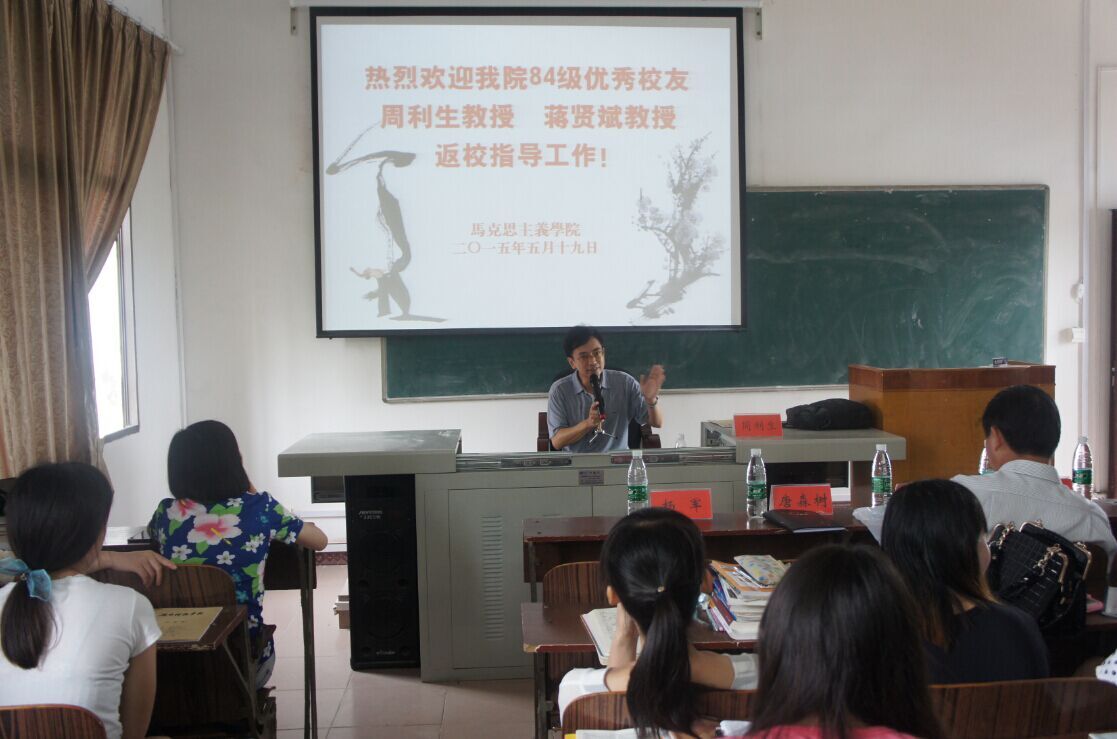本网讯(通讯员 曹金莎)5月19日上午,马克思主义学院邀请84级优秀校友周利生教授来校讲学。周利生以“坚定理想信念、做优秀大学生”为题给全院学生上了一堂生动的思想教育课。