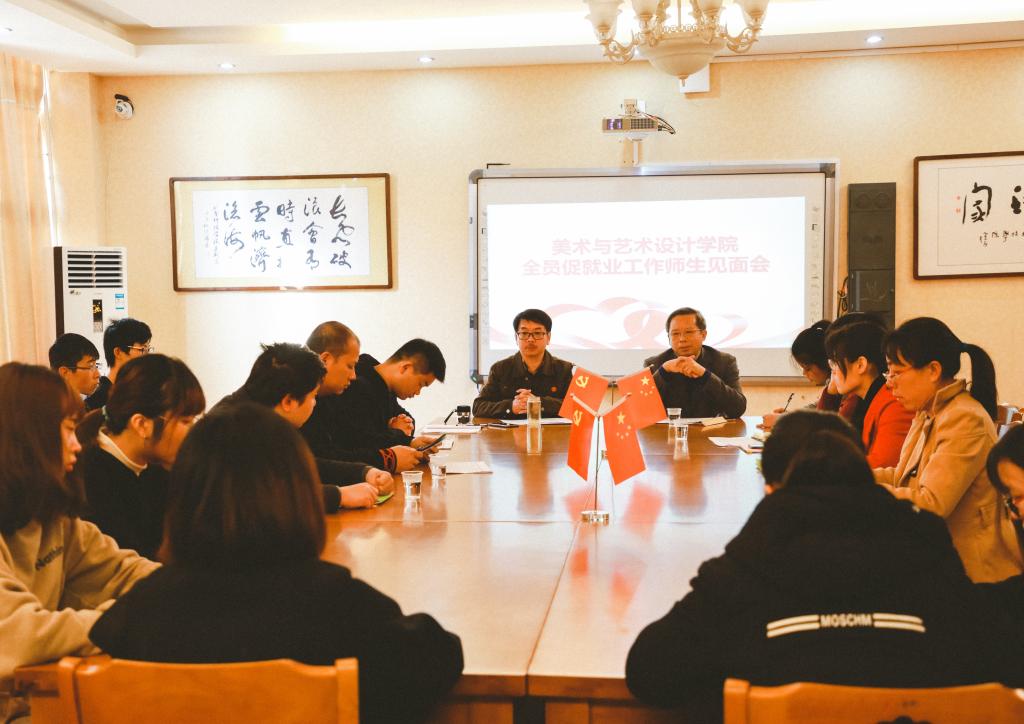 本网讯11月28日上午,美术与艺术设计学院在美术楼南楼202会议室召开了本年度全员促就业工作师生见面会。学校副校长郑山明、学校资产管理处副处长谷利民、美术学院院长张建利以及全体全员促就业指导老师、学生代表出席了会议。
