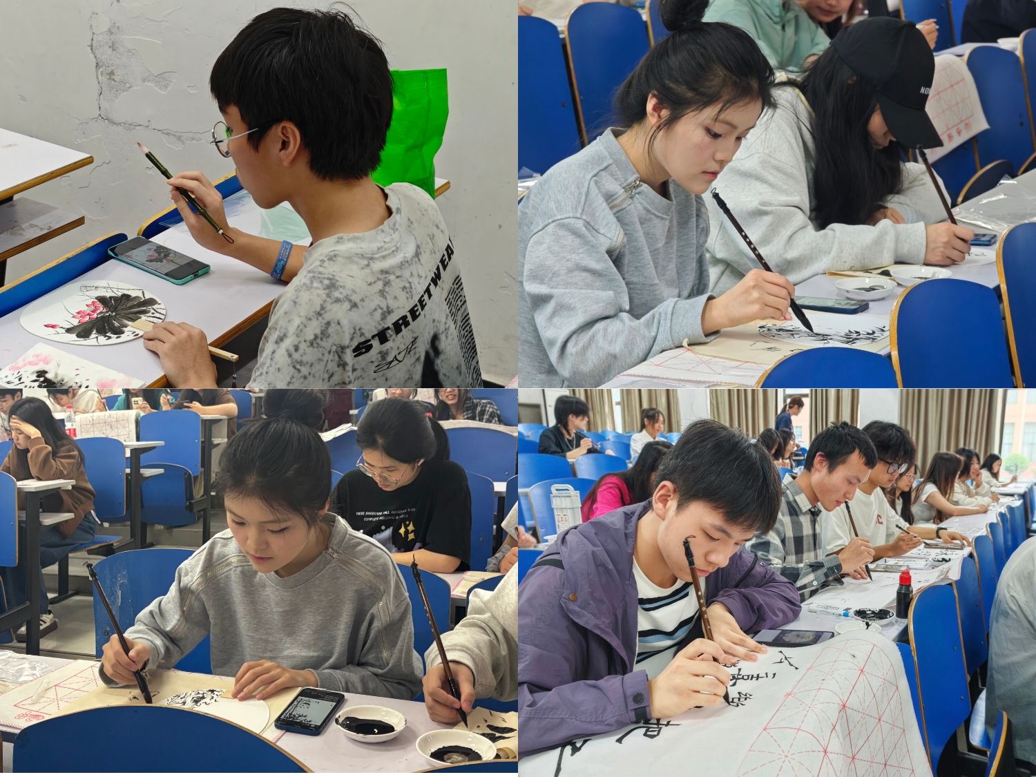 王任波教授结合扇面创作,讲解中国画基本绘画技巧,运用莲花、竹子等元素,阐释廉洁寓意;在创作环节中,从技法到内涵层层点拨,现场交流互动热烈,灵感不断碰撞。最后,创作者们结合自身作品,生动讲述作品的构思与寓意,引起同学们深刻共鸣。