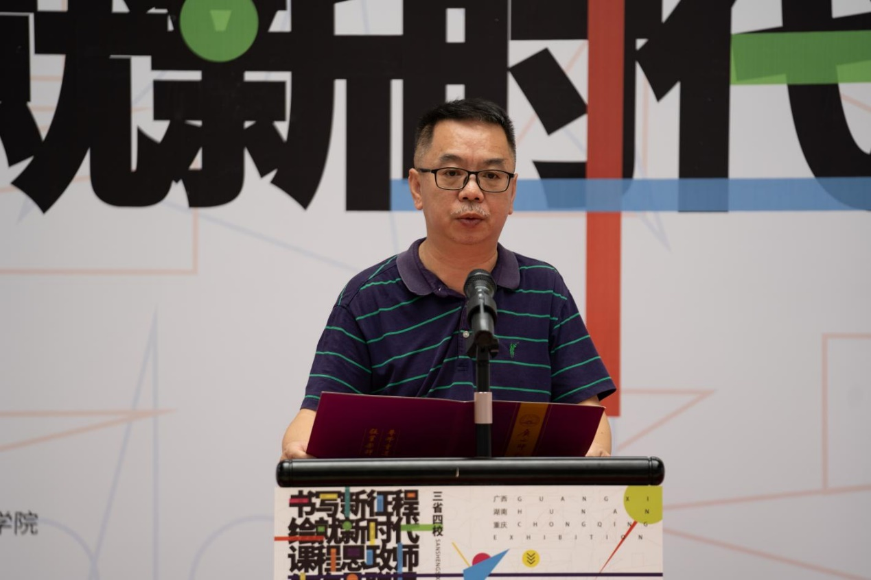 本网讯(通讯员 唐天田7月1日,由广西师范大学美术学院、西南大学美术学院、安博站官网登录入口_安博(中国)美术与艺术设计学院、河池学院美术与设计学院联合主办,广西师范大学校党委宣传部、美术学院联合承办的“书写新征程,绘就新时代”三省四校课程思政美术作品联展在广西师范大学纯道楼展厅开幕。我校美术与艺术设计学院院长张建利出席开幕式并致辞。